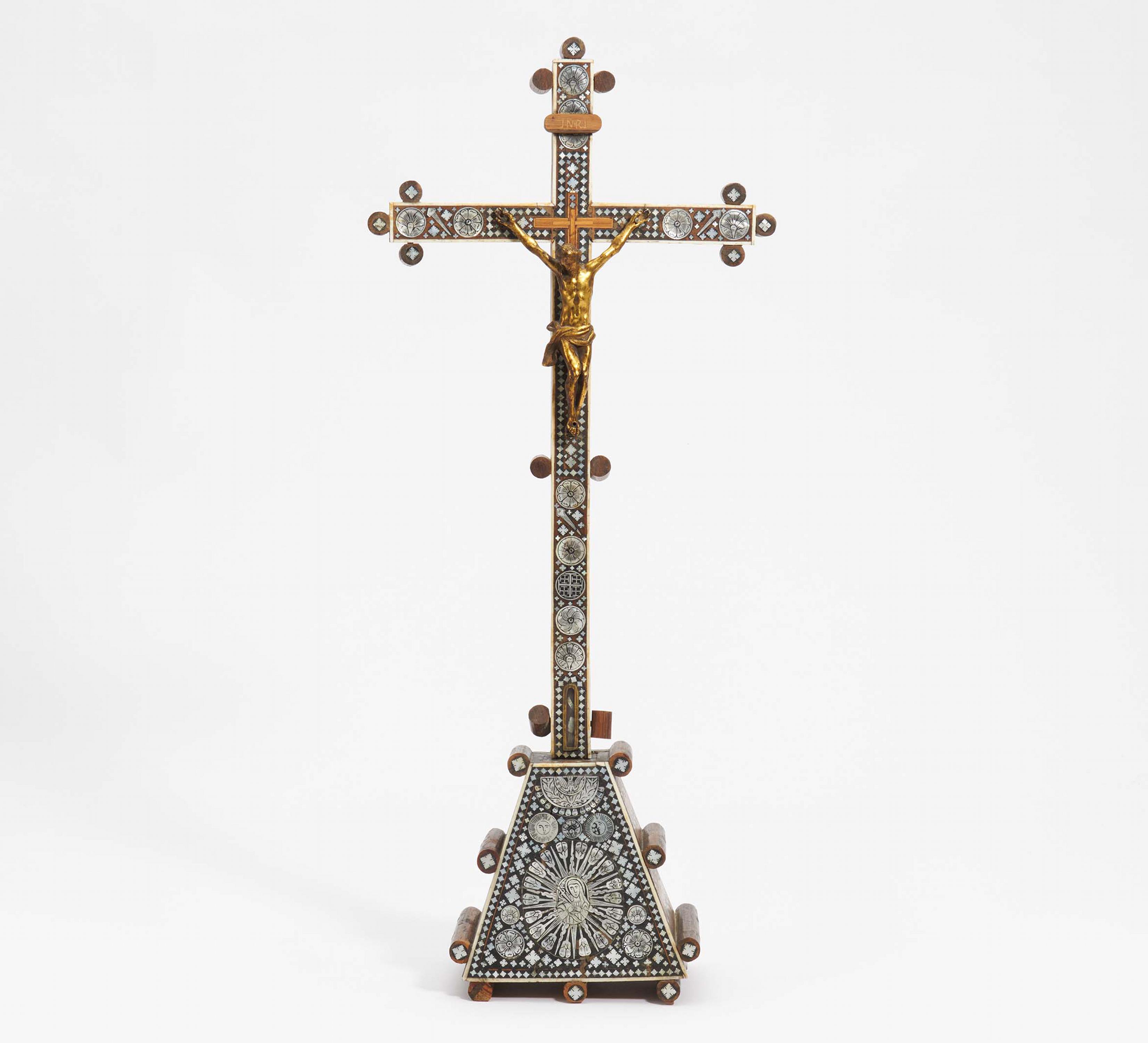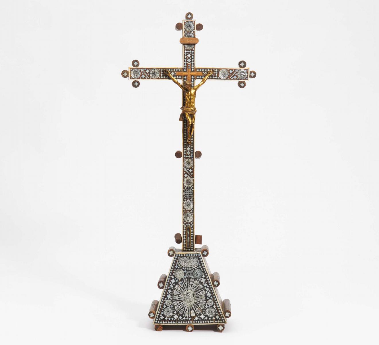 Geschlossene Reliquie am Fuß des Kreuzes. Korpus Messingguss.