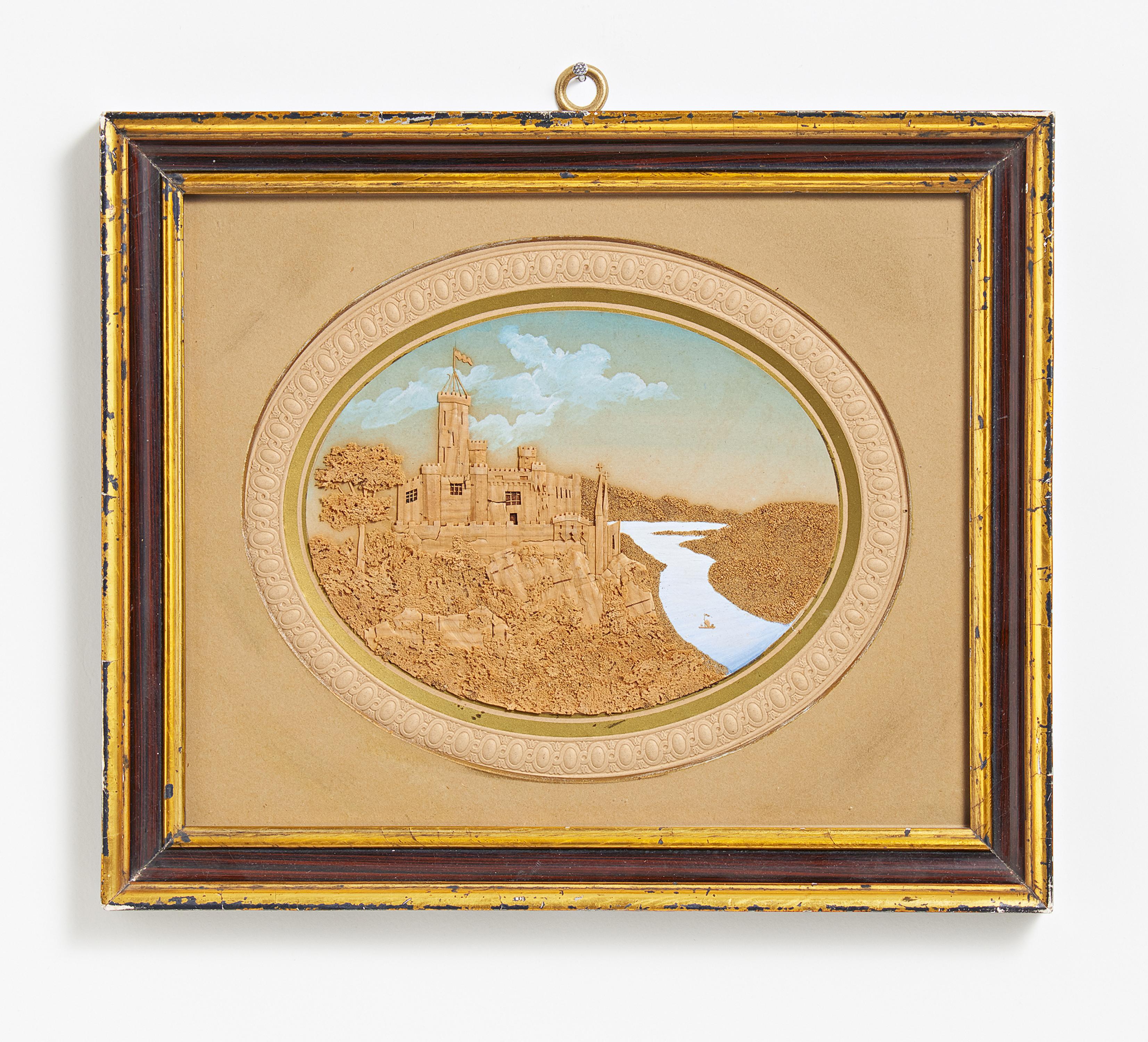 KLEINES OVALES KORKDIORAMA MIT ANSICHT DES SCHLOSSES STOLZENFELS AM RHEIN.
