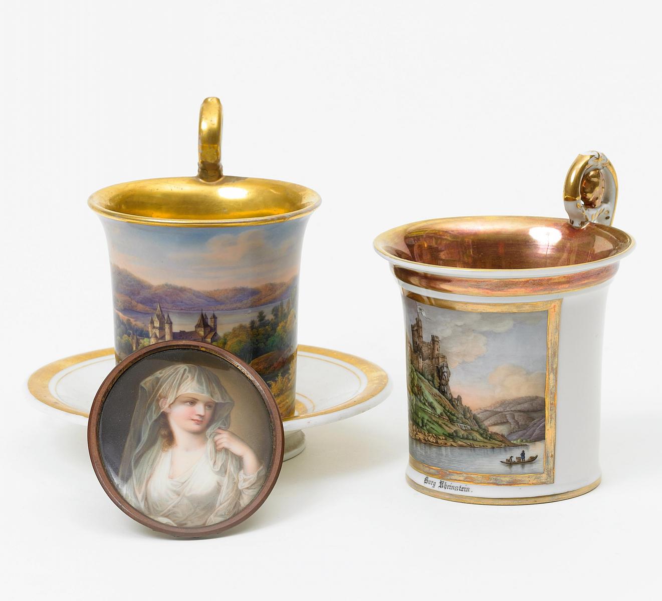 KONVOLUT ZWEI ANSICHTENTASSEN, EINE UNTERTASSE, EIN FRAUENPORTRÄT.