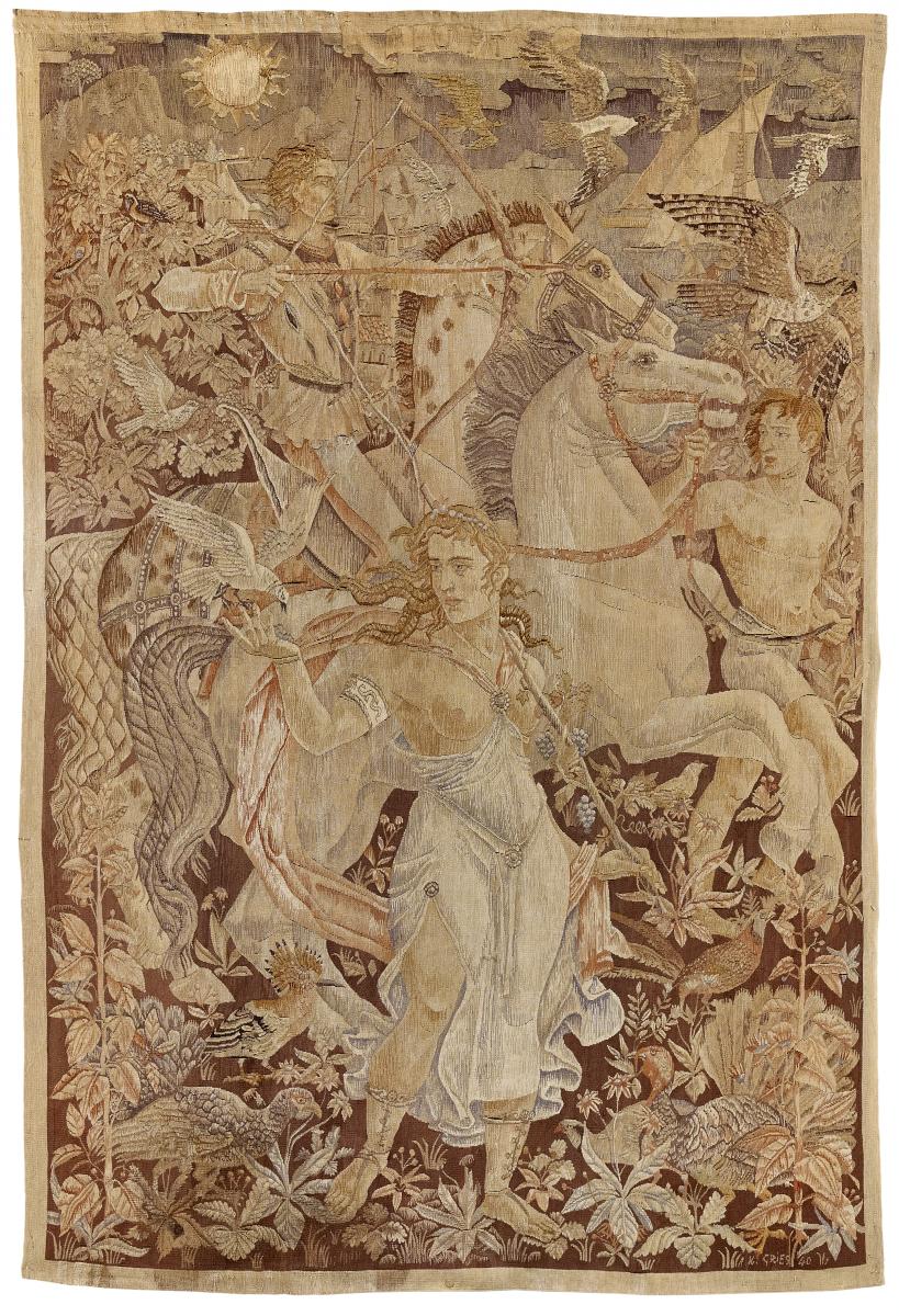 Wolle in dezent rötlicher Polychromie. Flüchtige Jagdszene an einem sonnigen Tag. Zwei Jäger, einer zu Pferde mit gespannter