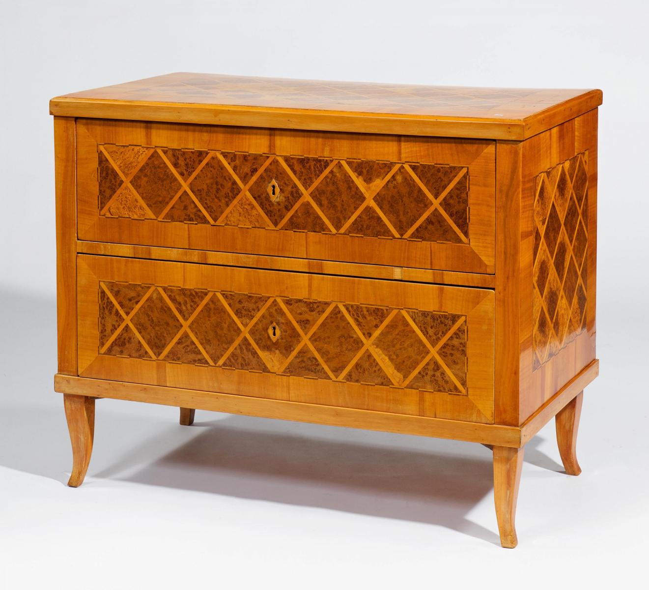 Technik: Kirschbaum, Wurzelholz und Ahorn eingelegt.