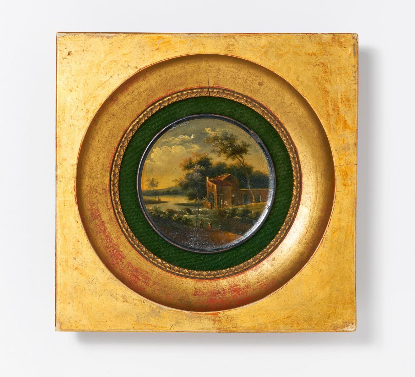 DOSENDECKEL MIT LANDSCHAFTSSZENE.