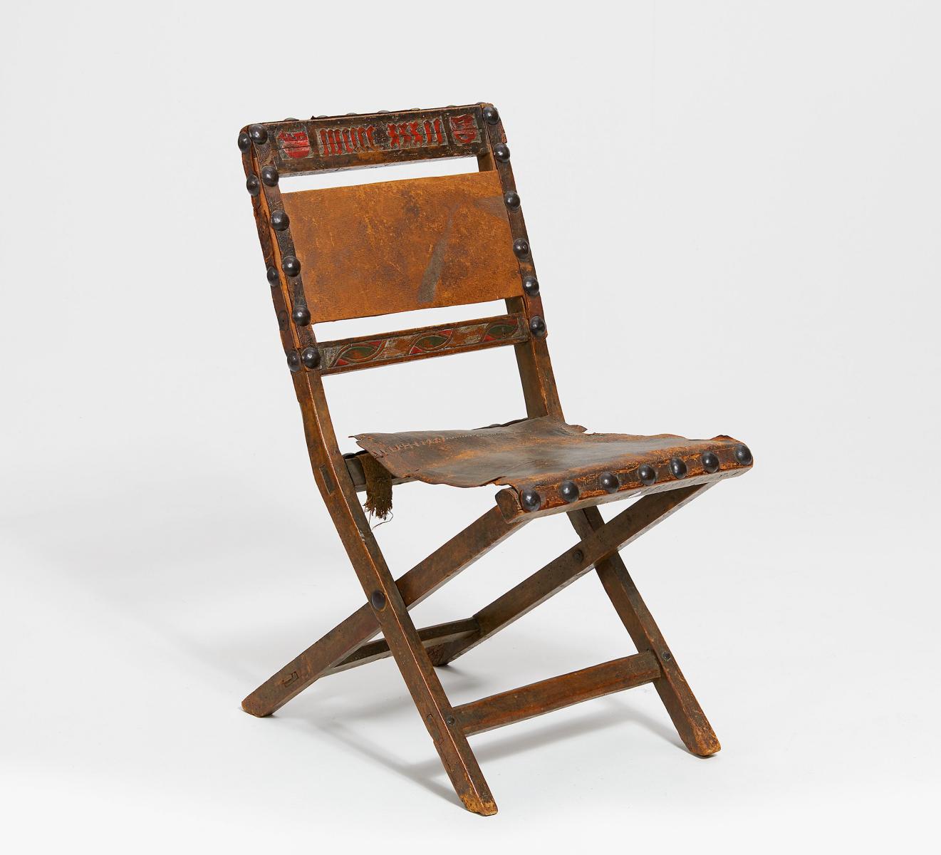 Technik: Eiche geschnitzt. Leder. Eisennieten.