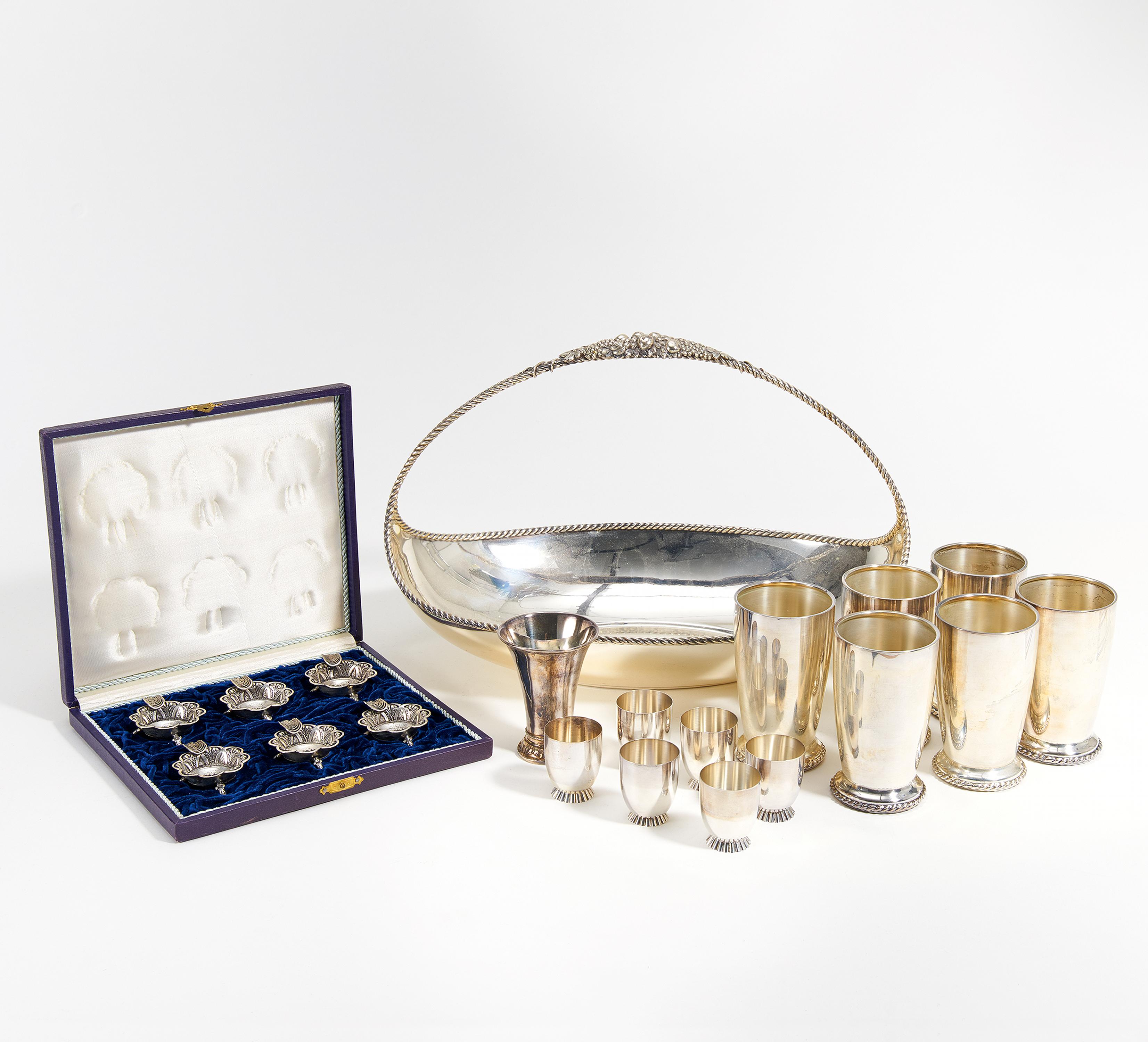 925, versch. MZ. Zustand A/B. Beilage: 6 Schnapsbecher, 1 kl. Becher, 6 kleine Ascher. Silber. Ca.186g. Versch. gemarkt.