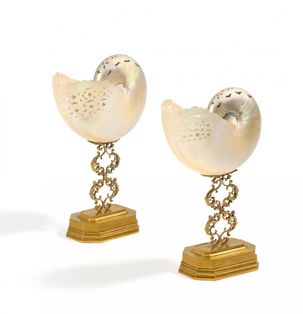 Technik: Nautilusschnecke tlw. durchbrochen gearbeitet. Feuervergoldete Bronzemontierung.