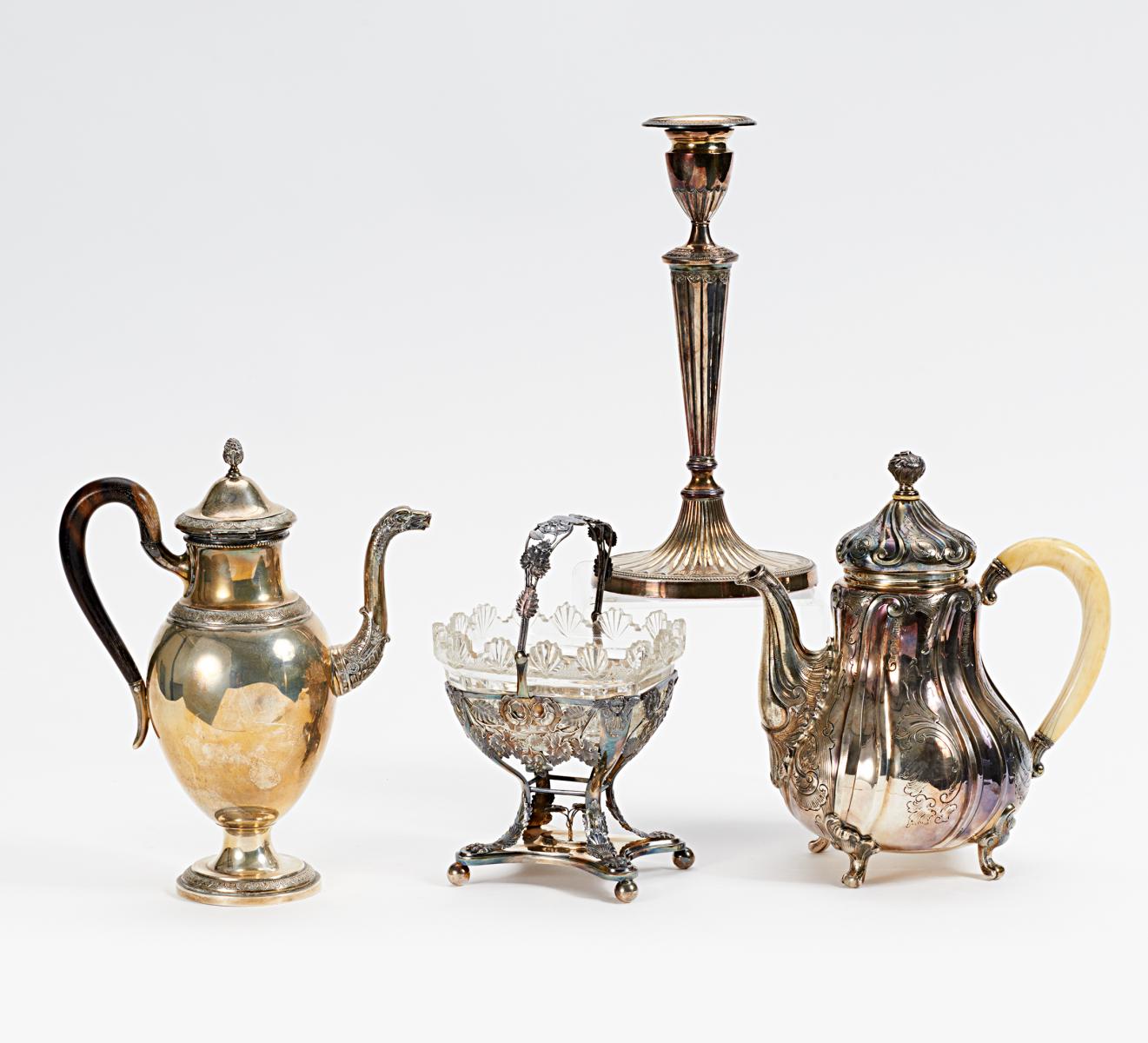 Beilage: Henkelkörbchen mit Glaseinsatz, Leuchter. Versilbert.