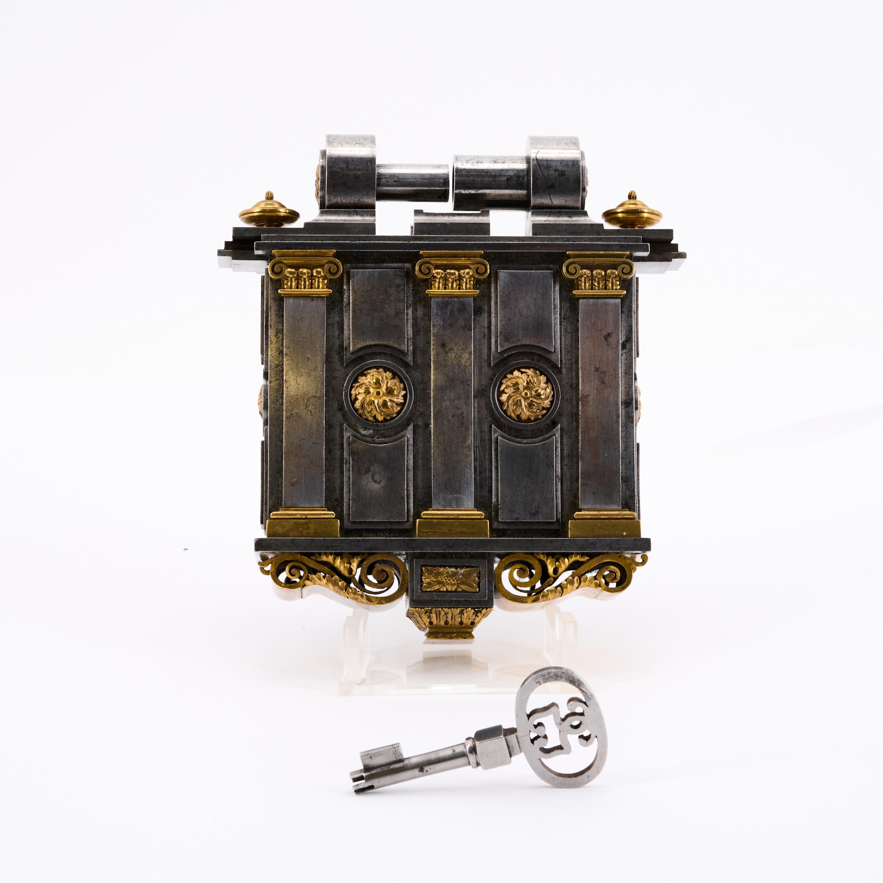 einer Art Gebälk abschließend. Das Schloss ist durch einen Trickmechanismus zu öffnen,