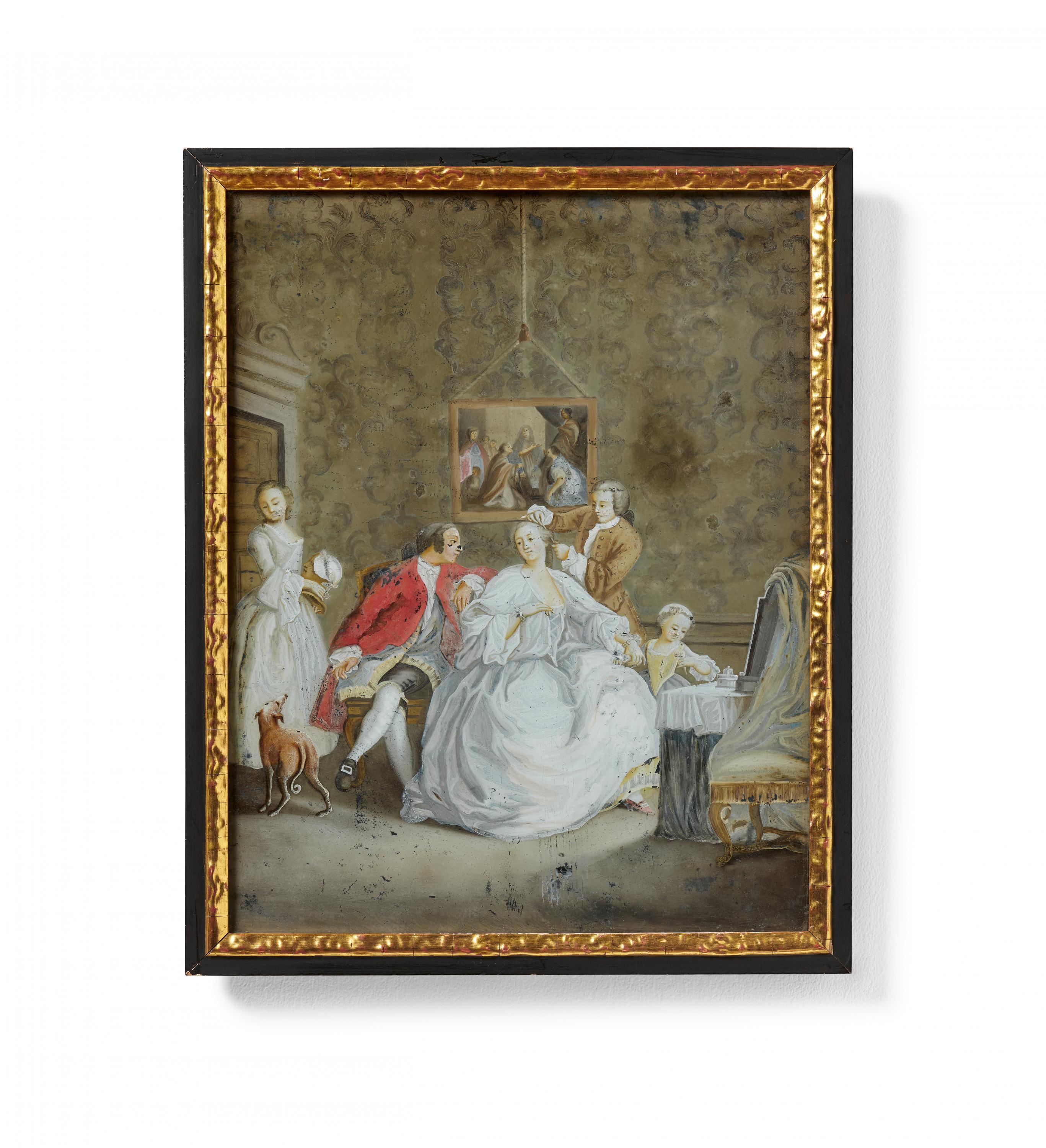 HINTERGLASGEMÄLDE MIT ANKLEIDESZENE.
