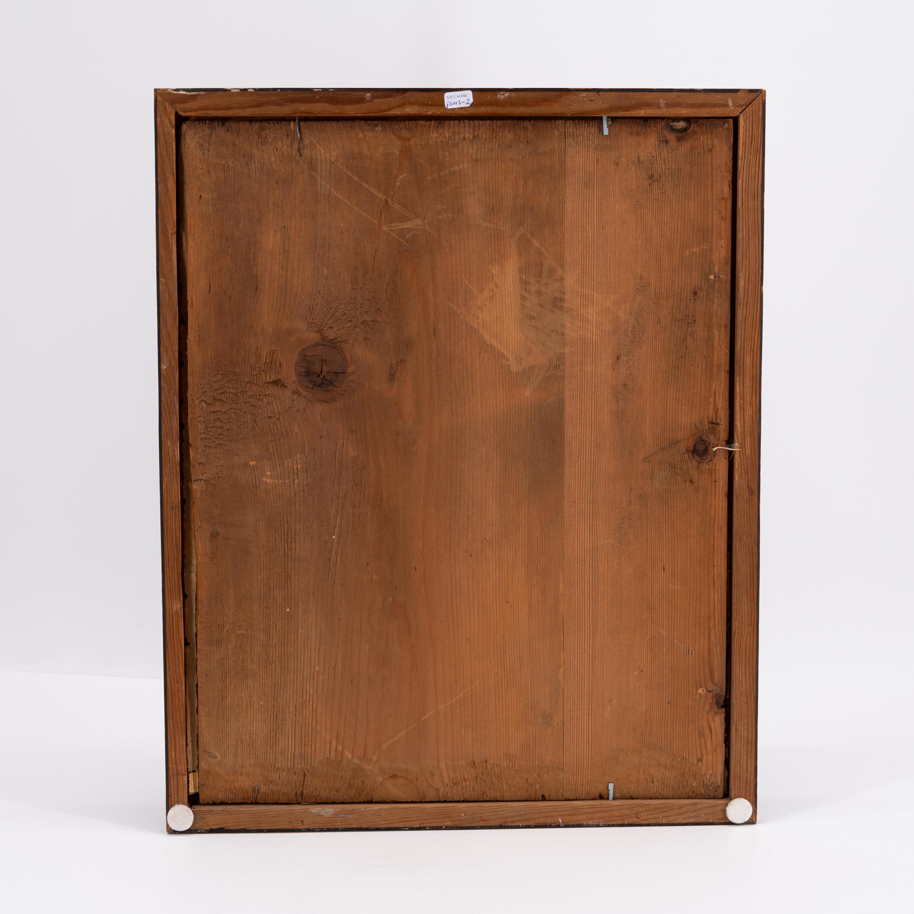 Technik: Glas mit deckendem Farbauftrag, teils in Églomisé-Technik mit Blattsilber hinterlegt.