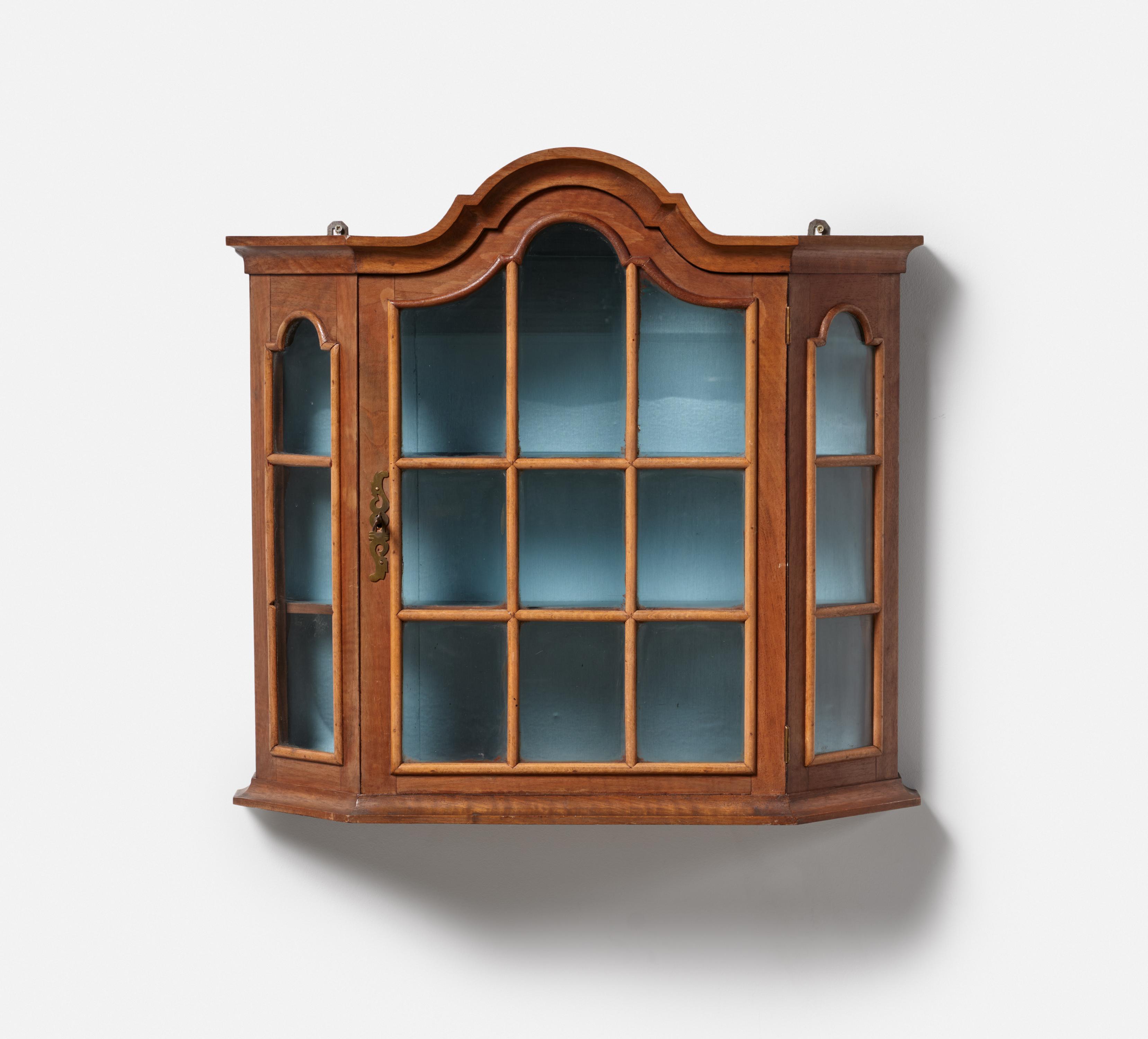 Technik: Wohl Kirschbaum. Dreiseitig verglast. Rückwand mit blauem Stoff bespannt.