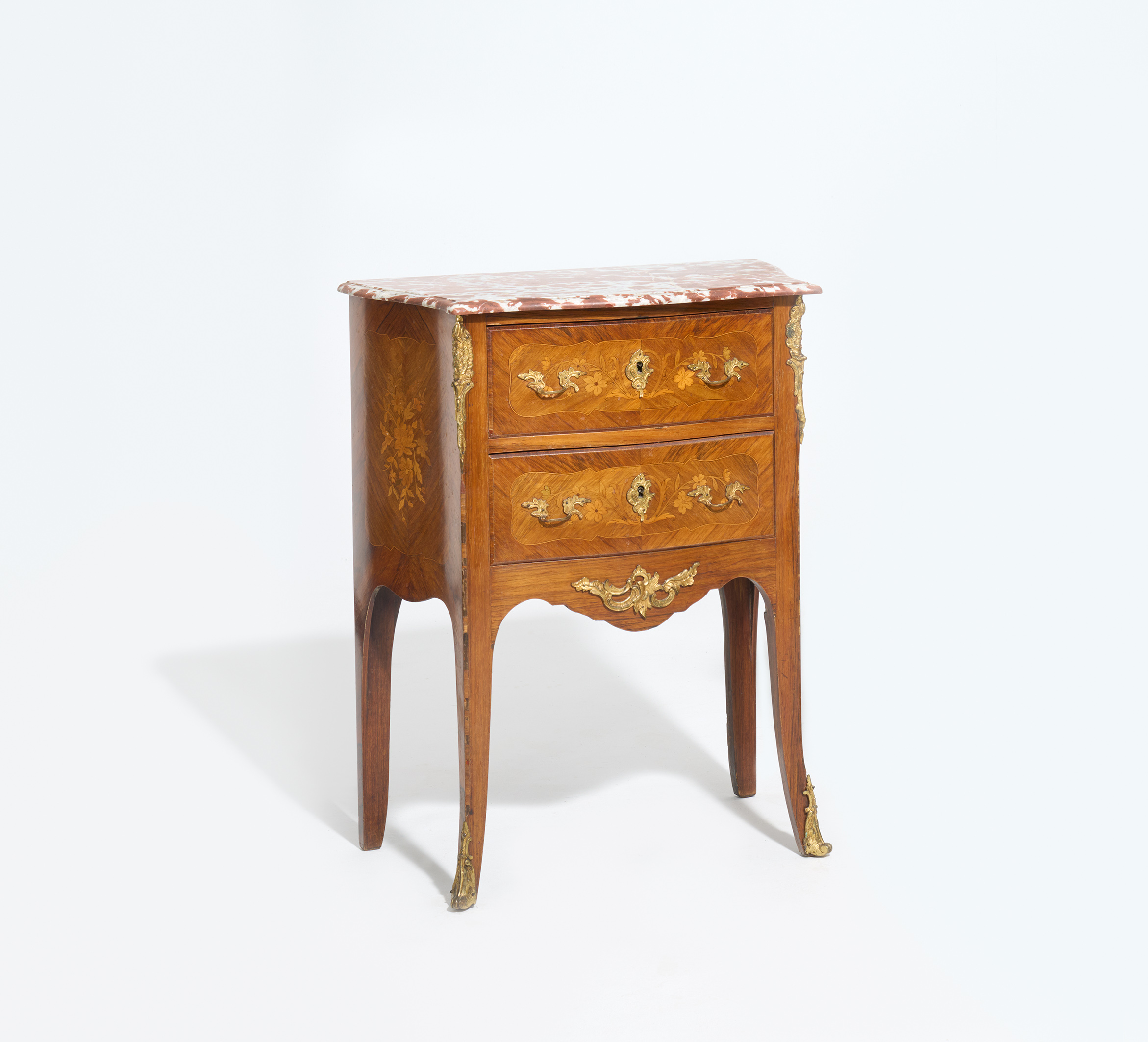 KLEINE KOMMODE AUF HOHEN BEINEN UND MIT FLORALEN EINLAGEN.