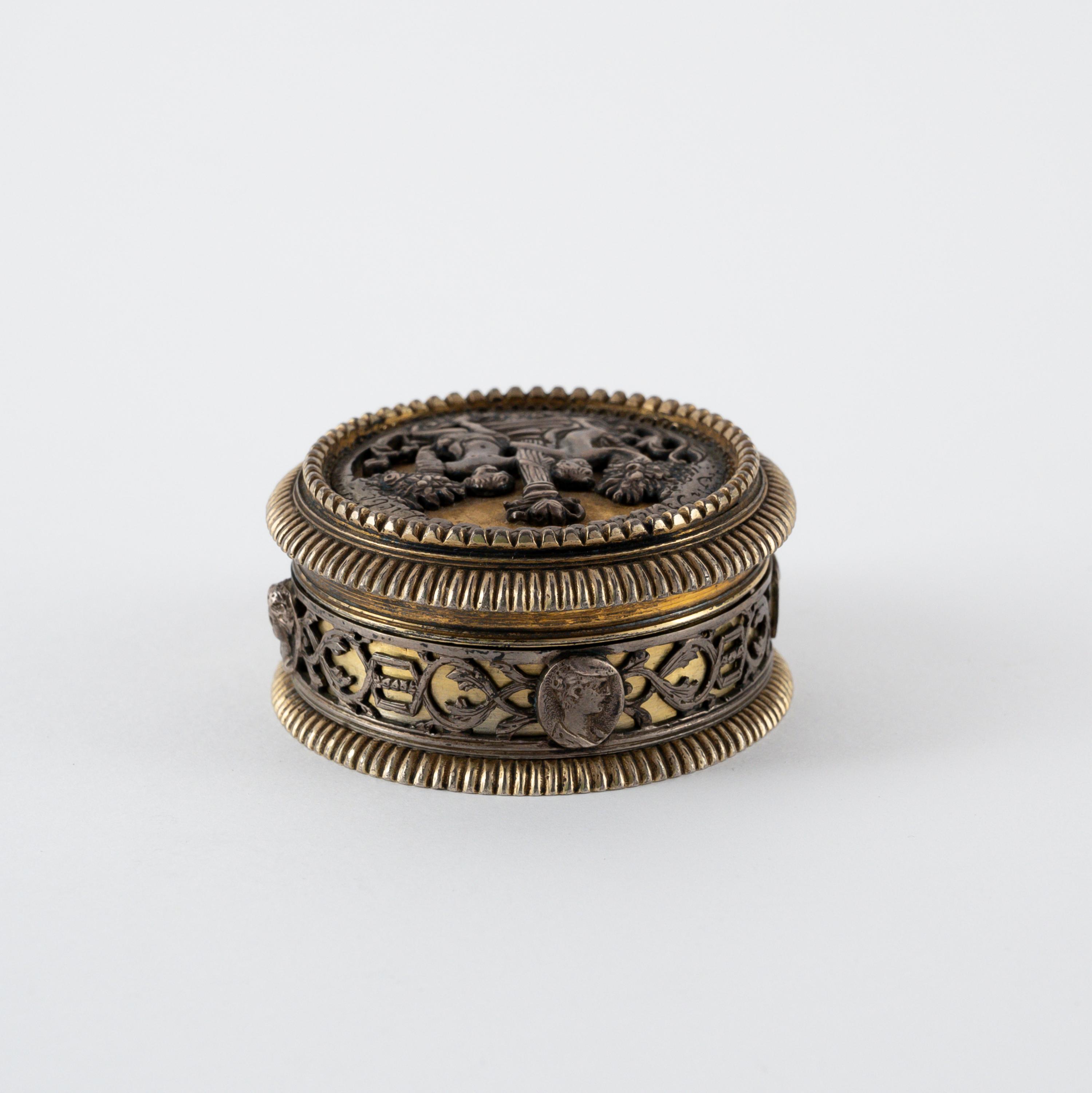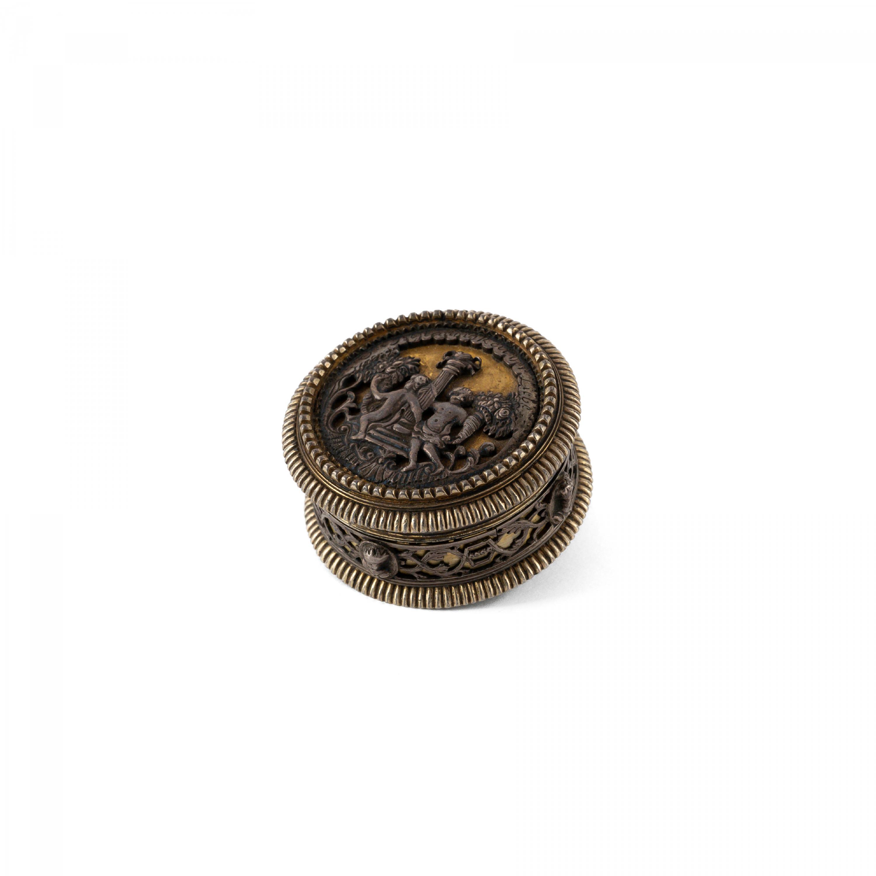 KLEINE RUNDE DOPPELDOSE MIT AMORETTEN AN ANTIKER SÄULE.