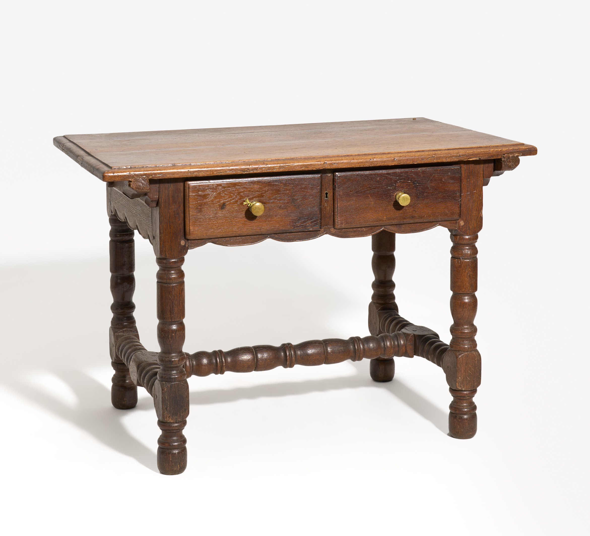 KLEINER TISCH MIT ZWEI SCHÜBEN UND GEDRECHSELTEN BEINEN.