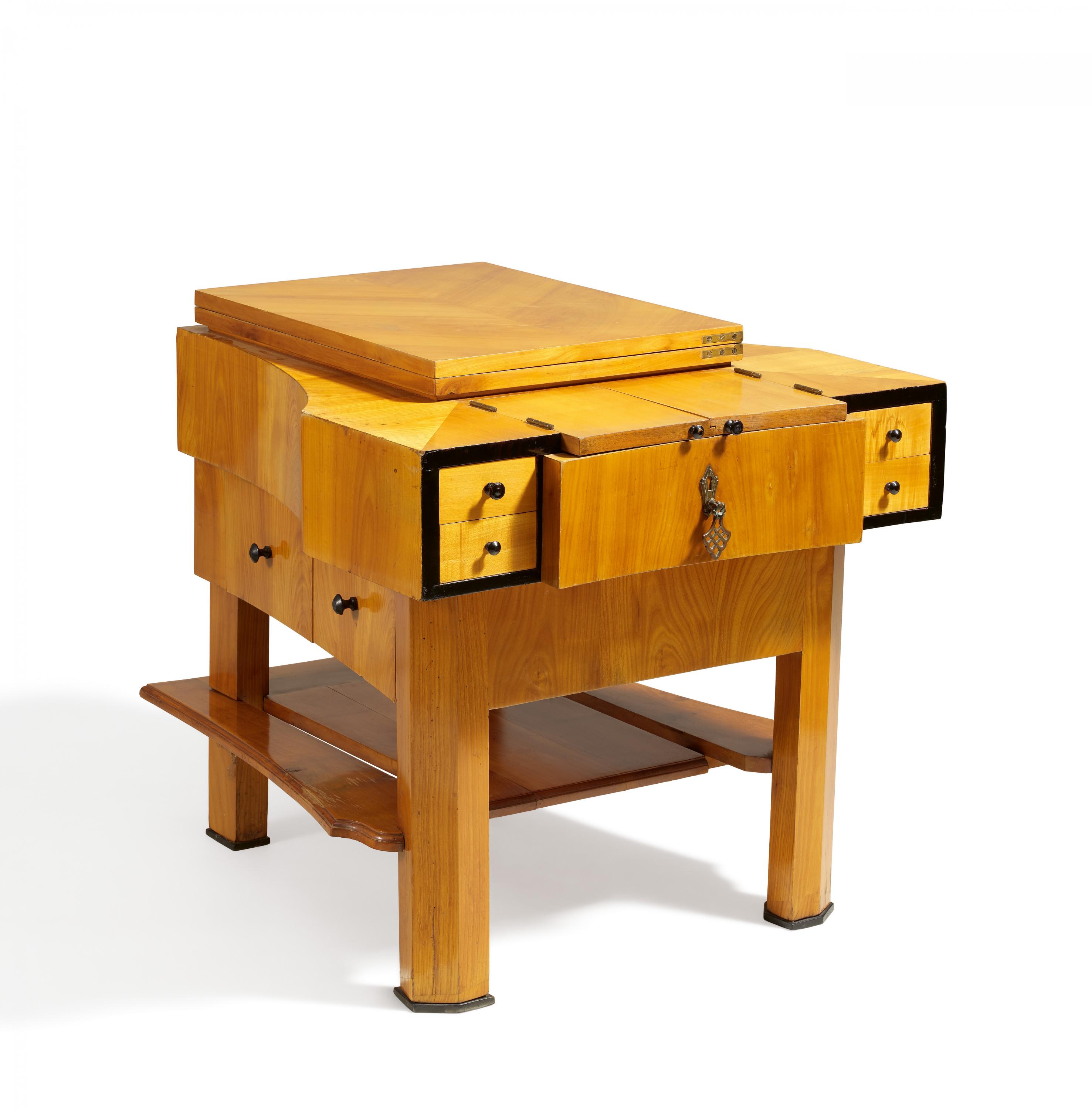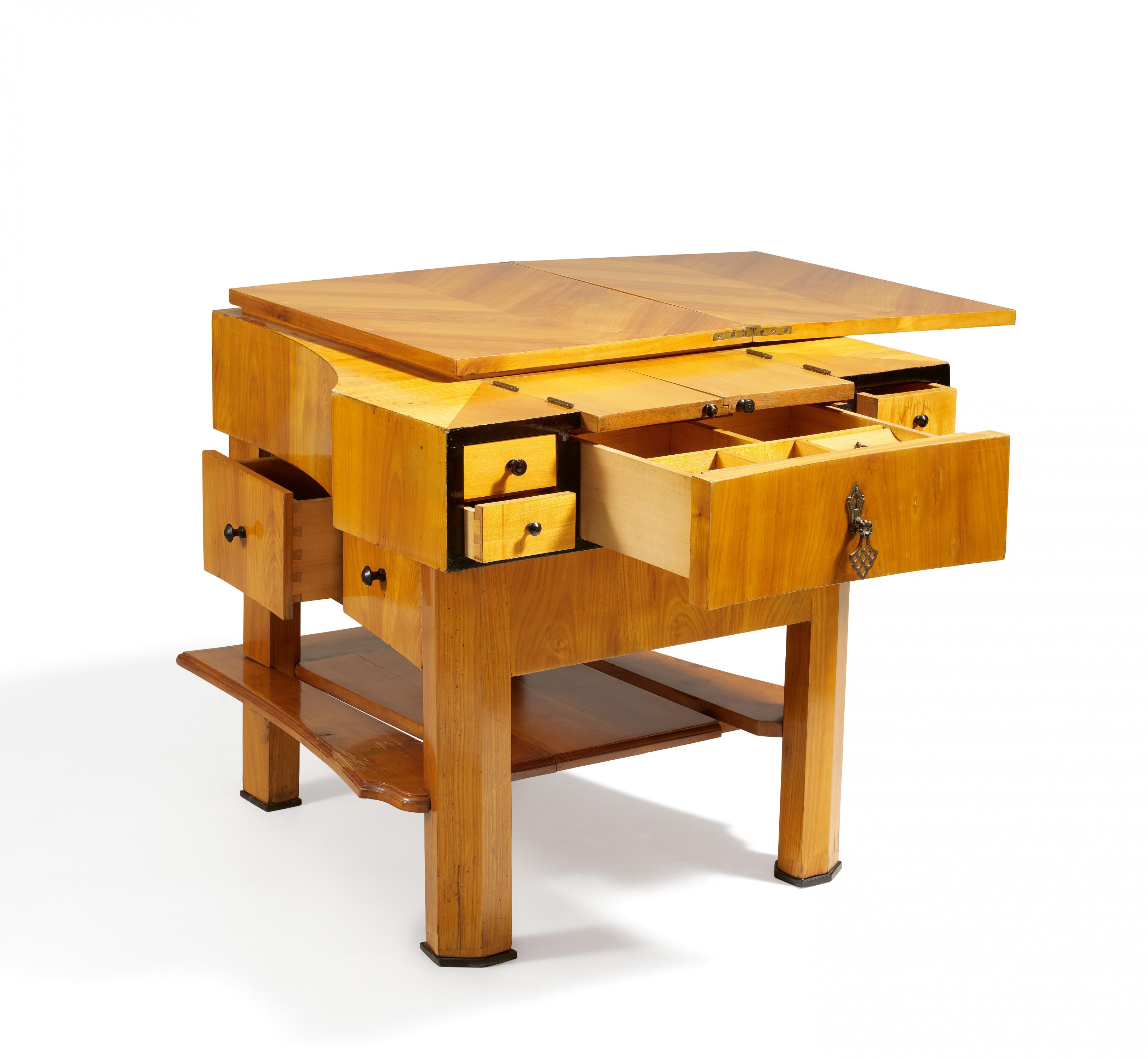 verschieden großen Schüben. Diese teilweise mit Einteilungen. Der Tisch ist von mehreren
