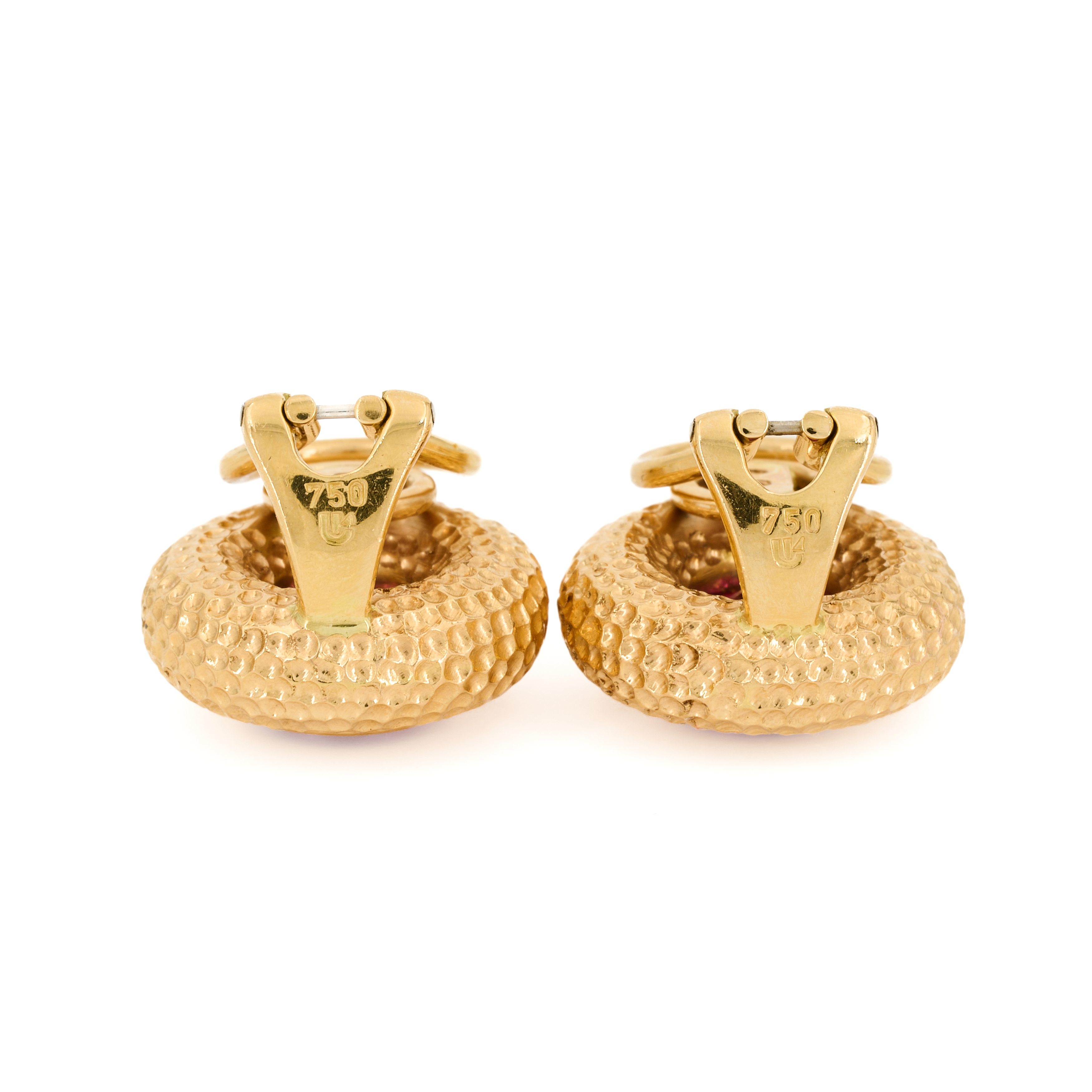 Beschreibung: Klassische Ohrclips aus Roségold mit gefräster Oberfläche, besetzt mit jeweils einem runden Rubellit in Zargenfassung. Juwelierpunze.