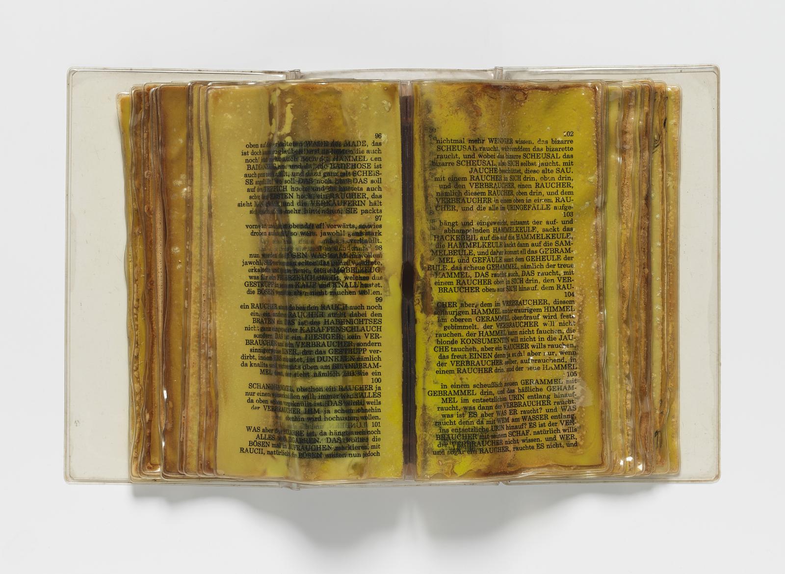 durchsichtige Plastikbeutel gefüllt mit Pudding und Urin. Buch aufgeschlagen: 25 x 39,5 x
