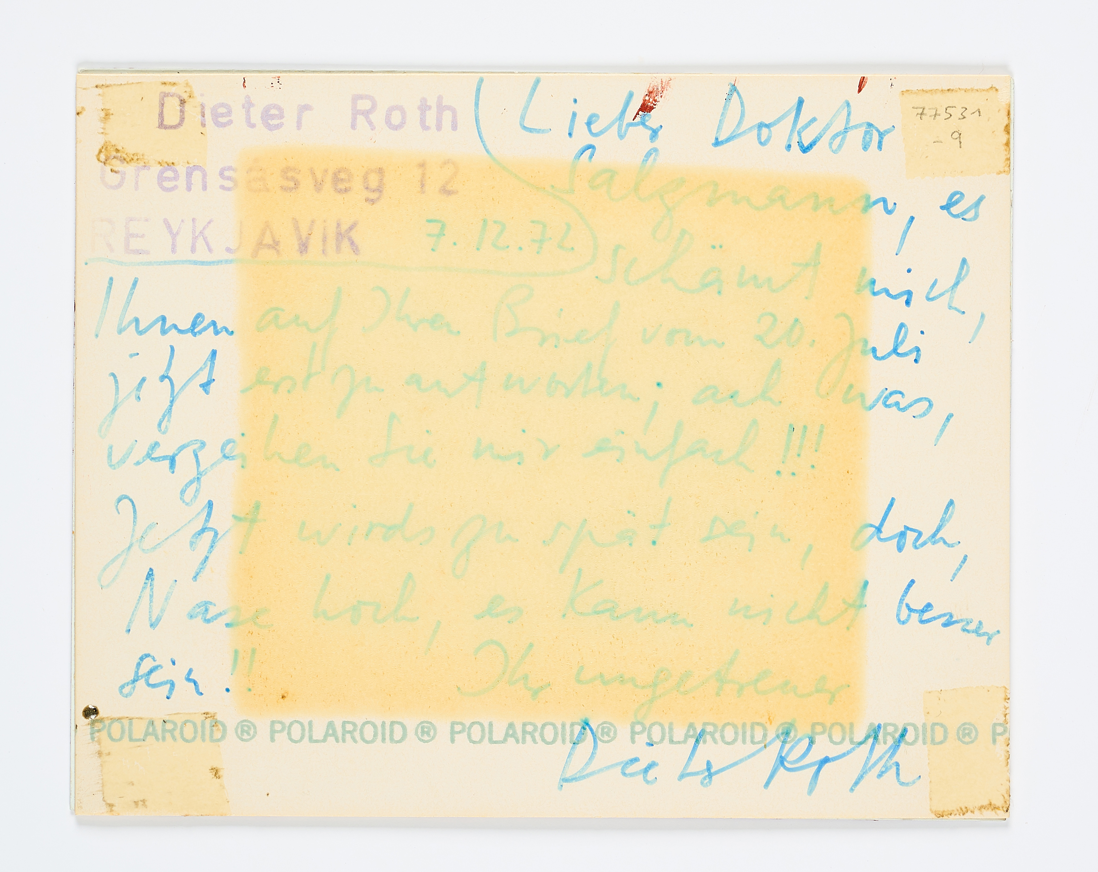 Vereinzelt kleine anhaftende Faserreste und Staubpartikel. Polaroid leicht ausgeblichen. Minimale Verschmutzungen am unteren Rand. Verso Reste alter Montierung sowie unregelmäßig gebräunt und minimale Verschmutzungen. Ansonsten guter Zustand.