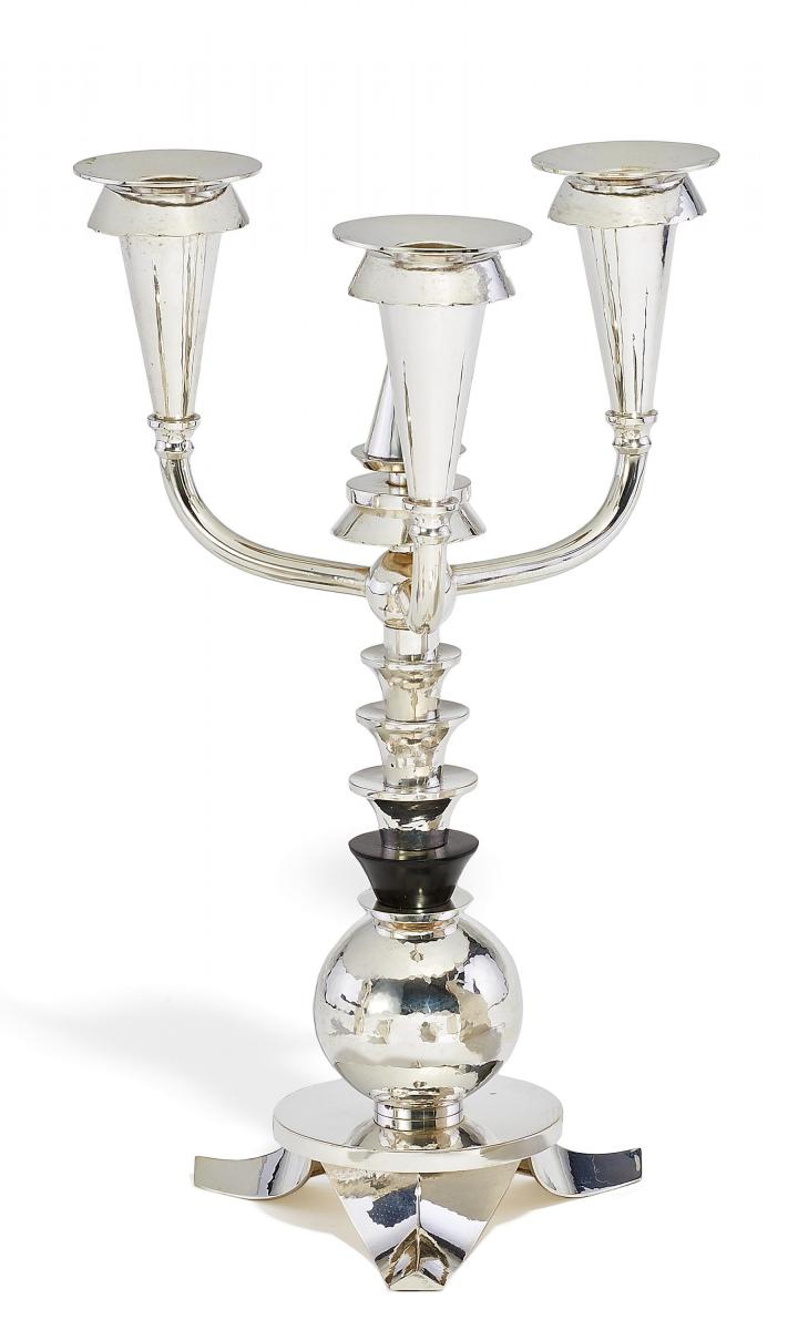 DREIFLAMMIGER LEUCHTER MIT GEOMETRISCHEN FORMEN.