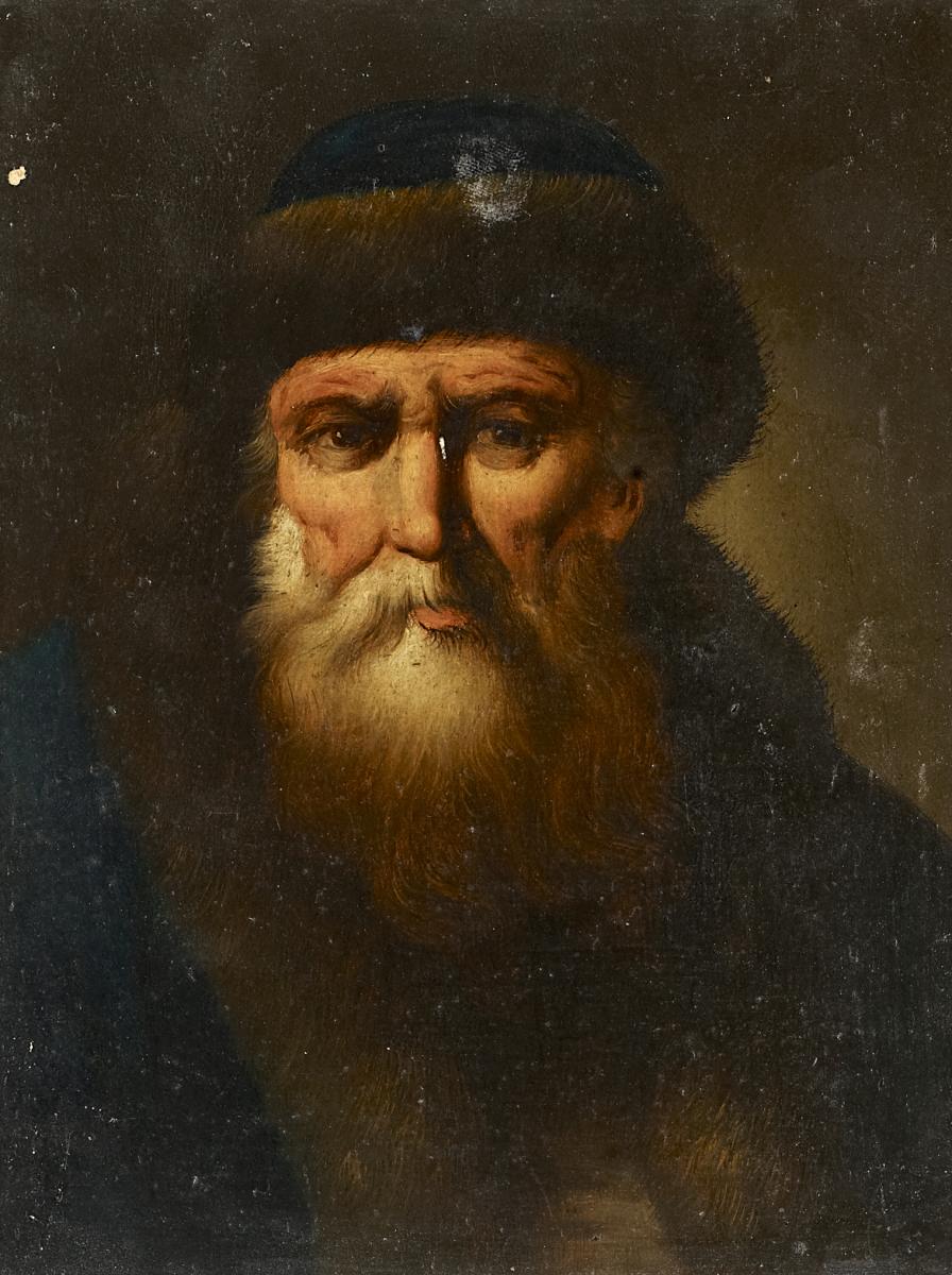 Bildniss eines Mannes mit Pelzkappe. Öl auf Papier. Auf Holz gezogen. 20 x 16cm. Rahmen.