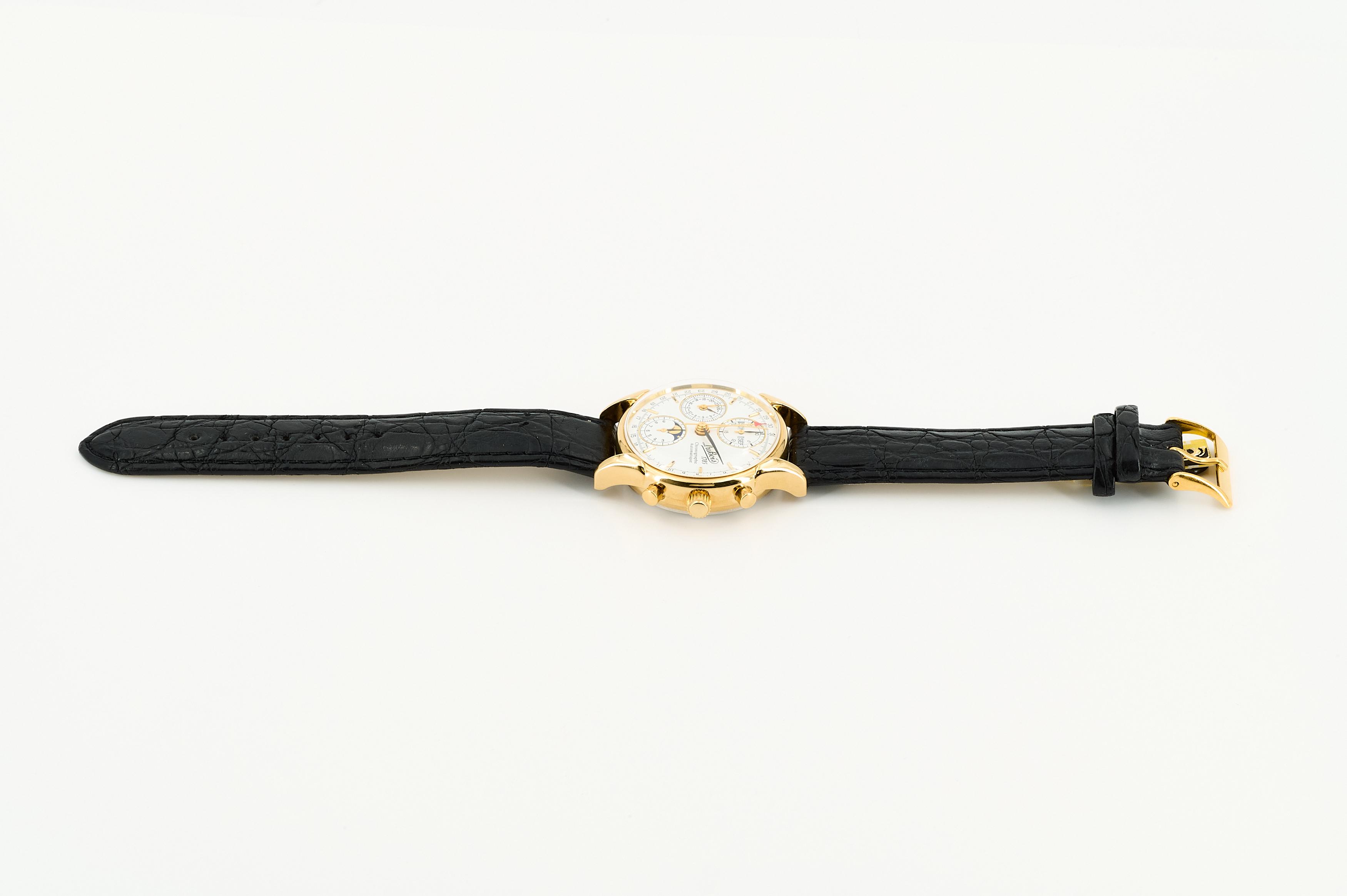 Beschreibung: 3-Zeiger-Chronograph mit Mondphasenanzeige und 12-Stundenzähler bei "6" Uhr, dezentraler