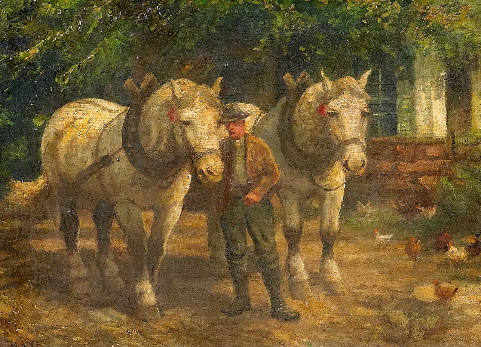 Bauer mit Zugpferden. Unleserliche Bezeichnung unten links. Öl auf Leinwand. 35 x 48cm. Rahmen.