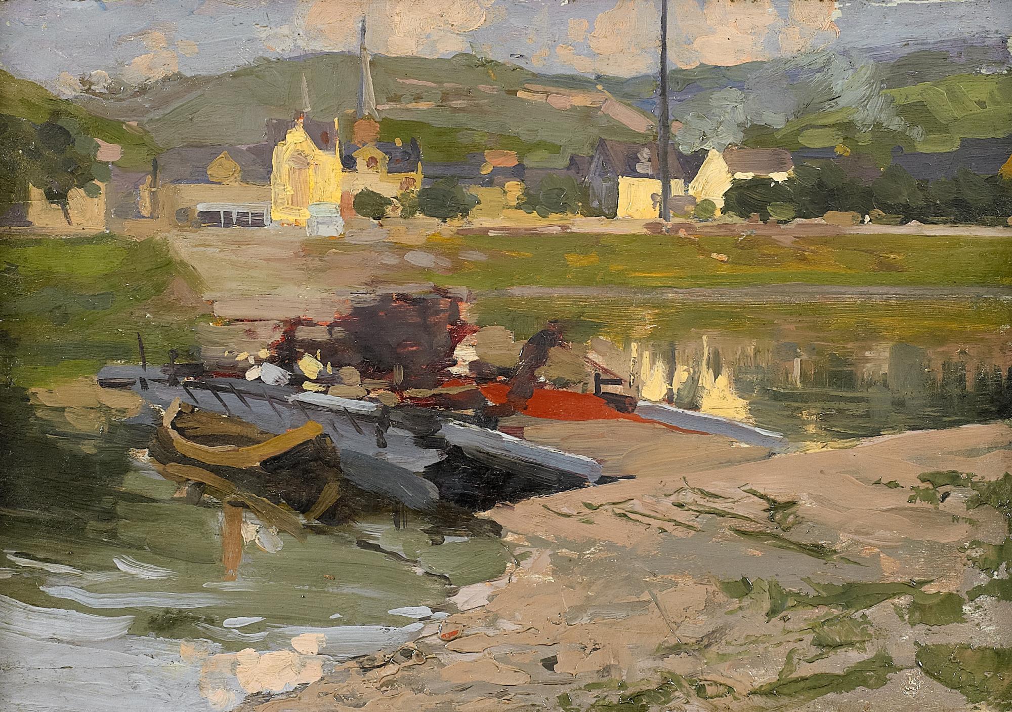Landschaft mit Fähre. Öl auf Holz. 22 x 31,5cm. Rahmen.