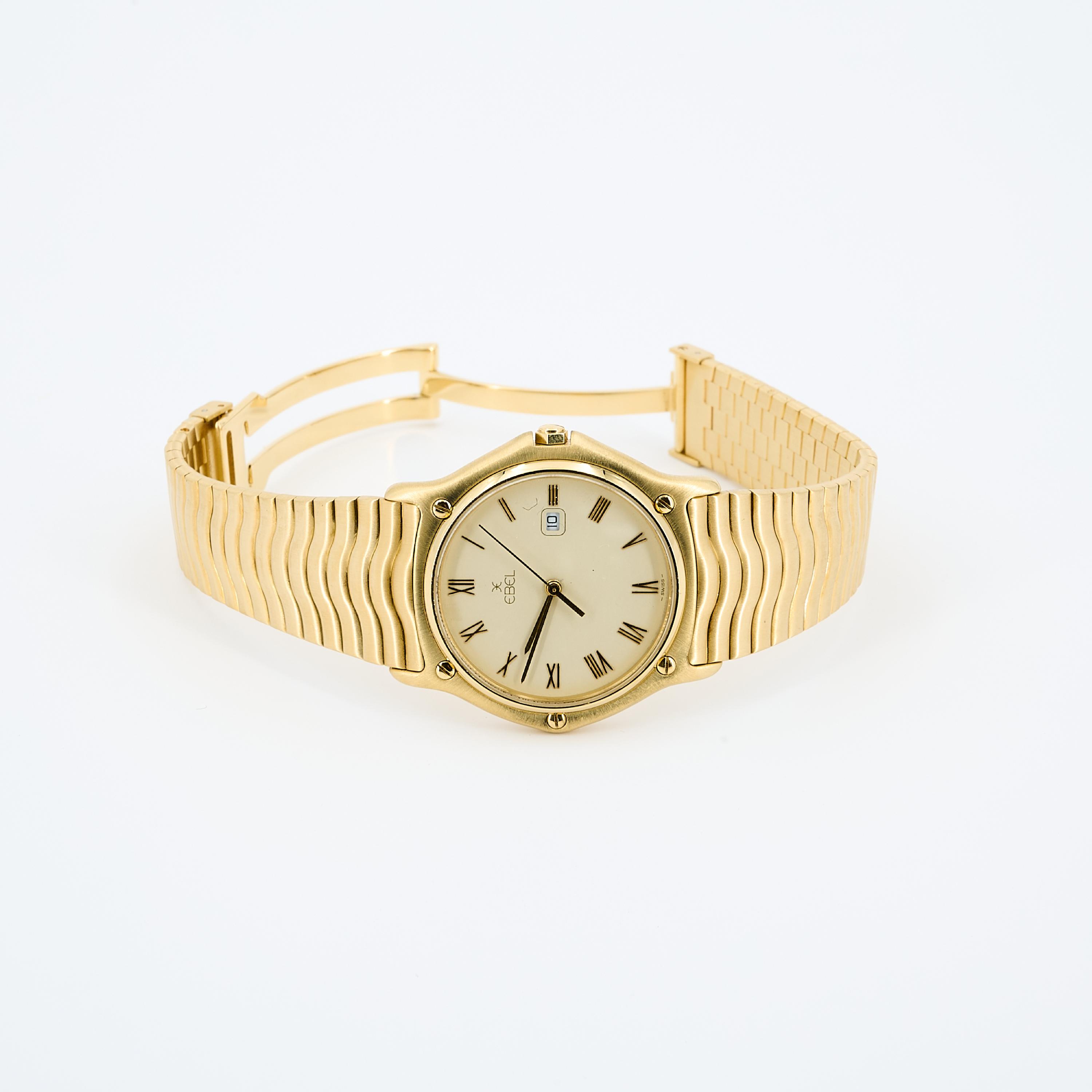 Gehäuse/Armband: 750/- Gelbgold, Gliederarmband mit Faltschließe, Zffbl. cremefarben, Zeiger golden, römische aufgesetzte Indizes golden.
