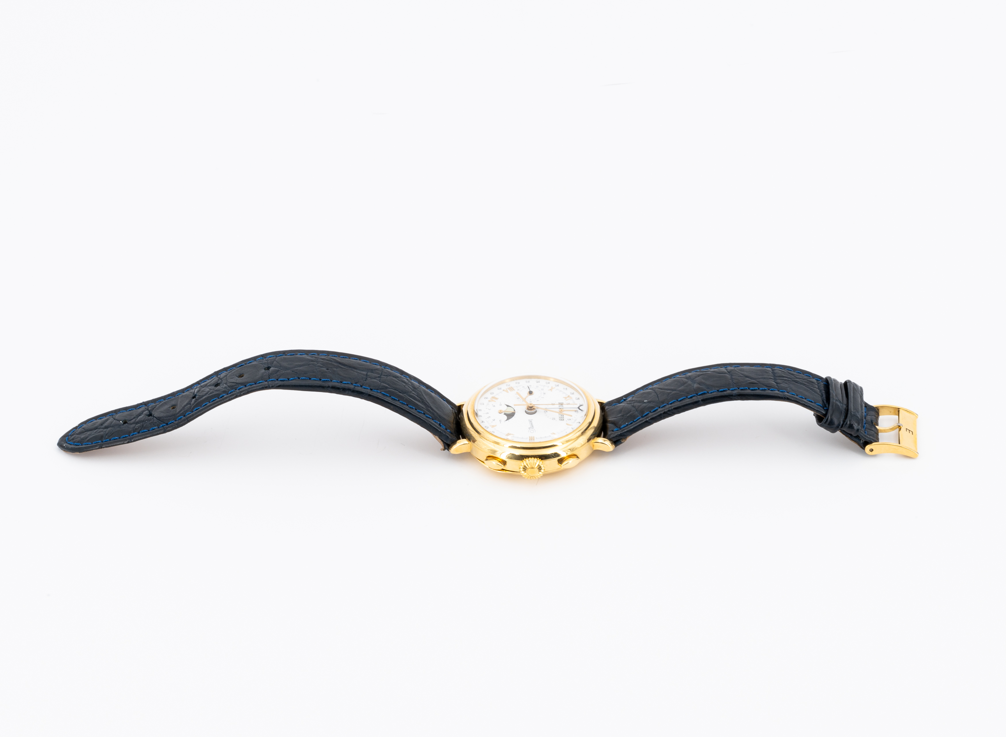 Beschreibung: 3-Zeiger-Chronograph mit Mondphasenanzeige und 12-Stundenzähler bei "6" Uhr, dezentraler Sekunde und 24-Stundenanzeige, 30-Minutenzähler, Wochentags- und Monatsanzeige bei "12" Uhr und Zeigerdatum aus dem Zentrum.