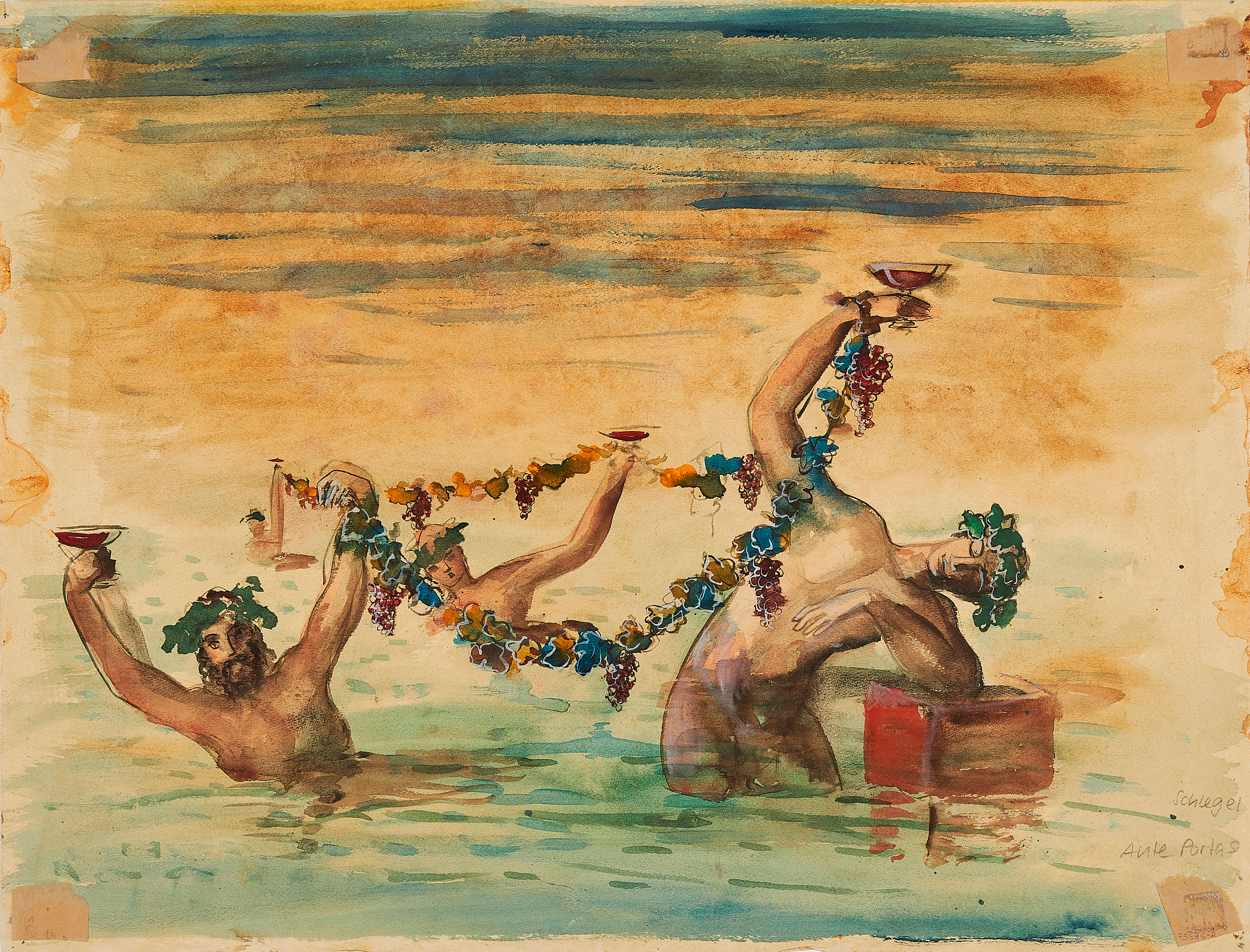 Arbeitsspuren. Minimale Griffspuren. Stecknadellöcher in den Ecken. Verso minimal gebräunt. Reste ehemaliger Montierung in den Ecken sowie entlang der oberen Kante. Ansonsten befindet sich die Arbeit in einem sehr guten Zustand.