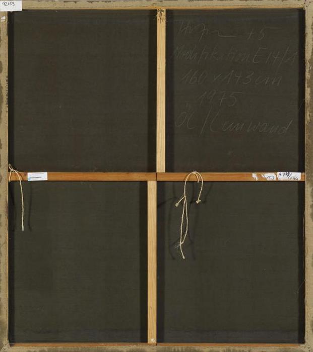 Bezeichnung: Signiert, betitelt und datiert verso: Hofschen +5 Modifikation E14/1 1975 sowie mit Maß-und Technikangaben versehen. Auf Keilrahmen zusätzlich bezeichnet.