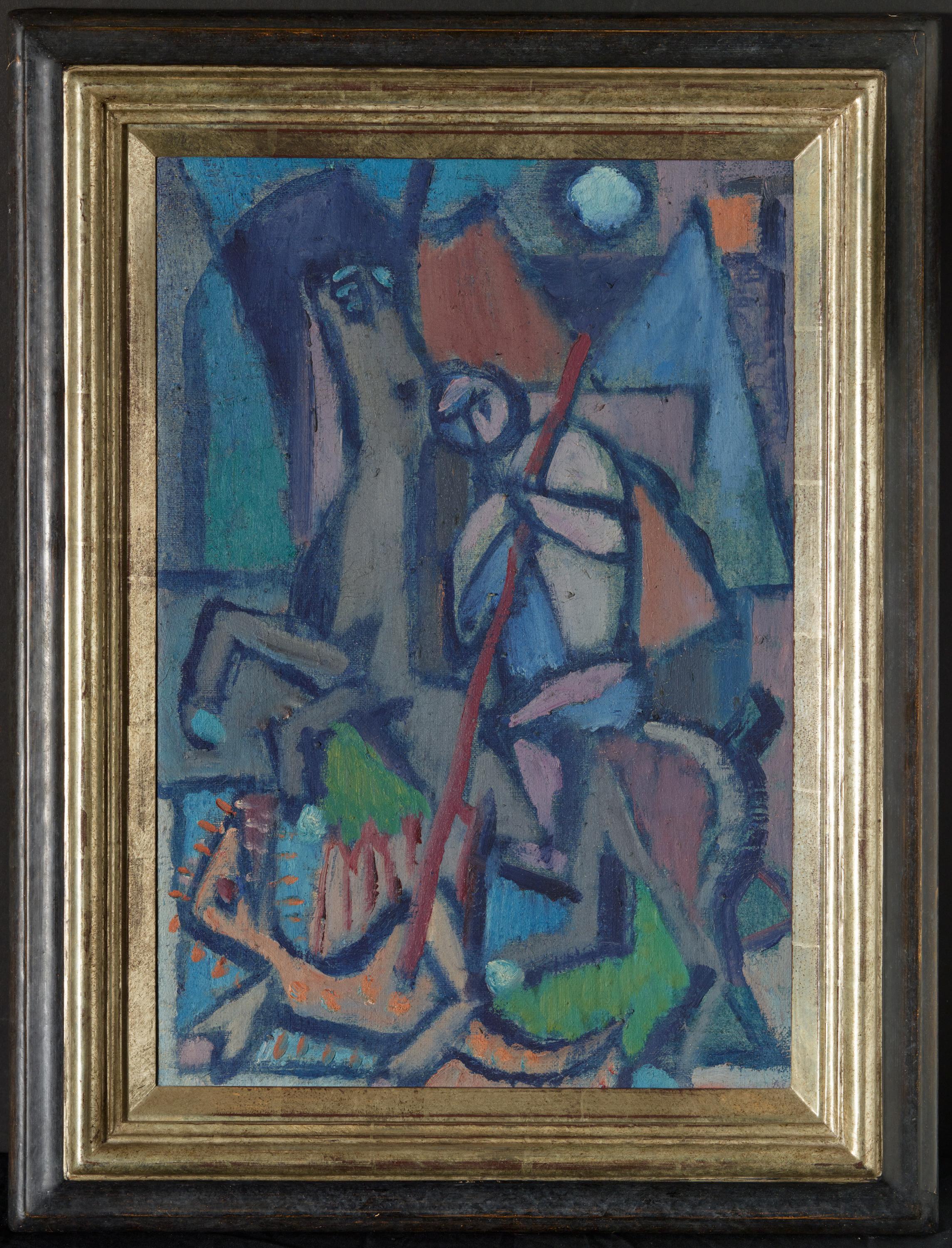 Leichte Staubablagerungen. Partiell minimales Krakelee. Minimal verschmutzte Malfläche. Kleiner Farbverlust in der Flanke des Pferdes (ca. 0,1 x 0,1cm). Unter UV-Licht punktuelle Retuschen in der oberen Bildhälfte zu sehen. Ansonsten guter Zustand. Im Rahmen beschrieben.