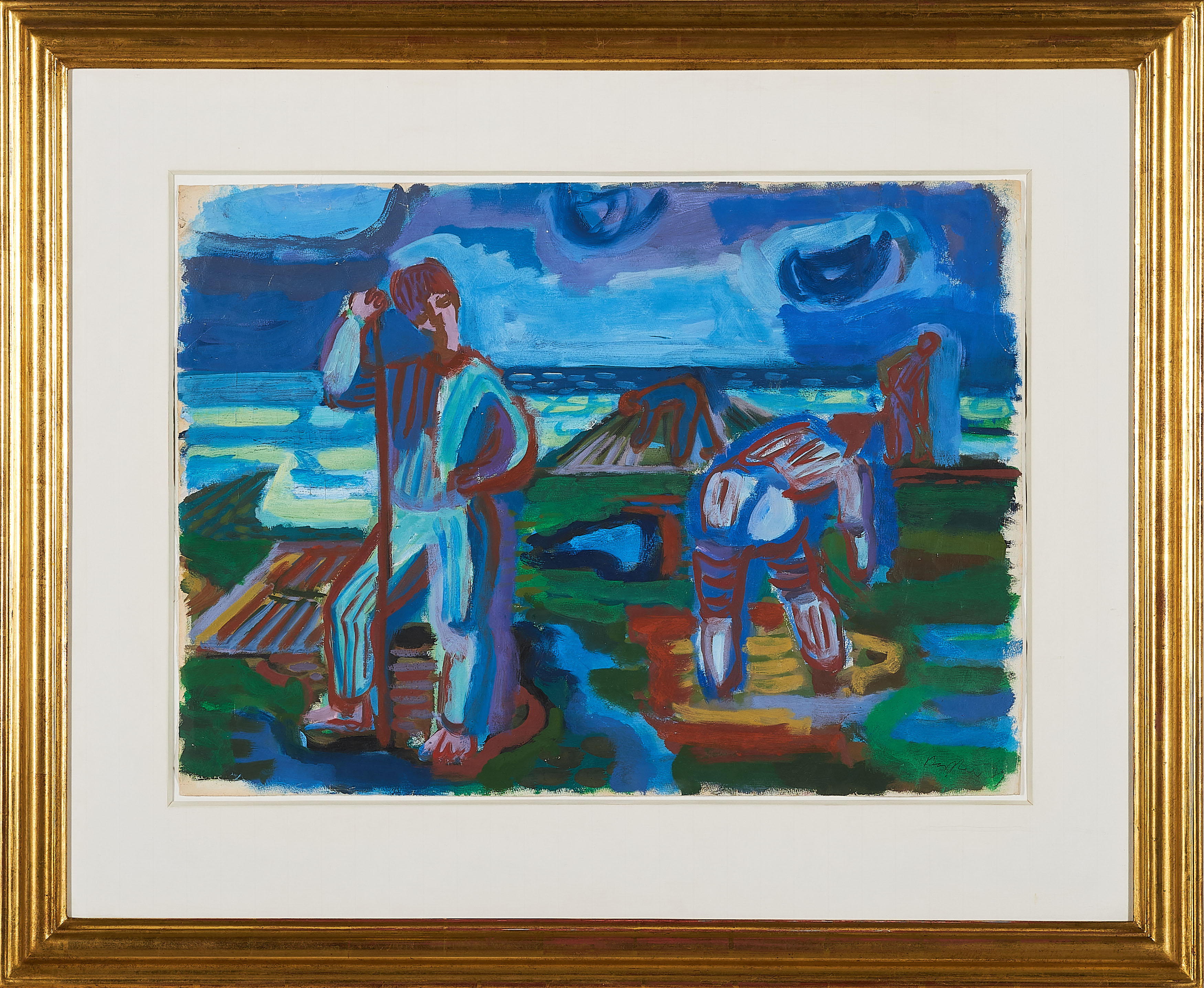 Herstellungsbedingt leicht gewellt. Leichte Knickspuren sowie kleine Einrisse in den Randbereichen. Krakelee, vereinzelt mit minimalem Farbausbruch. Verso montiert. Ansonsten sehr guter Zustand. Im Rahmen beschrieben.