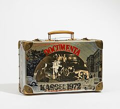 Documenta Kassel. 1972. Alukoffer, bemalt, bedruckt, beklebt. 31 x 40 x 12cm. Bezeichnet auf der Vorderseite: DOCUMENTA KASSEL 1972. Auf einem Messingschildchen nummeriert, monogrammiert und datiert: 175, K 73 sowie zusätzlich verblombt und gestempelt D.E.D.. Auf der Rückseite des Koffers weitere Hinweise zum Gebrauch.Verlag der Dome Edition Düsseldorf, Kunsthalle Düsseldorf (Hrsg.). Ex. 175/300.