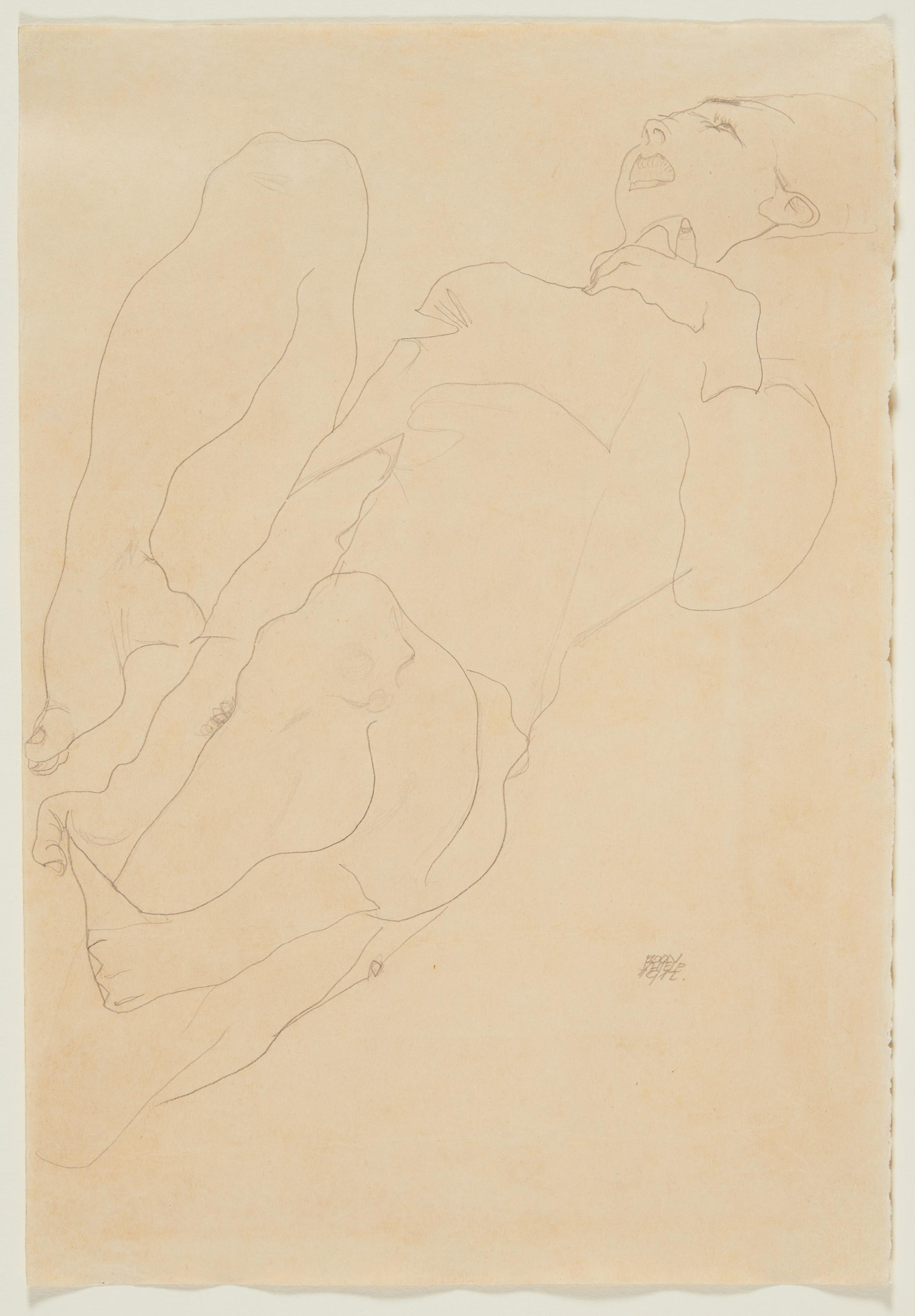Egon Schiele, der Hochbegabte, der manische Zeichner und Maler, der mit seinem Talent immer auffiel, aber bei Hütern der Tradition auch immer aneckte, der fokussiert war auf die Darstellung des menschlichen Körpers und auf seine Sexualität, zeigt in dieser Zeichnung alles und doch auch nichts.