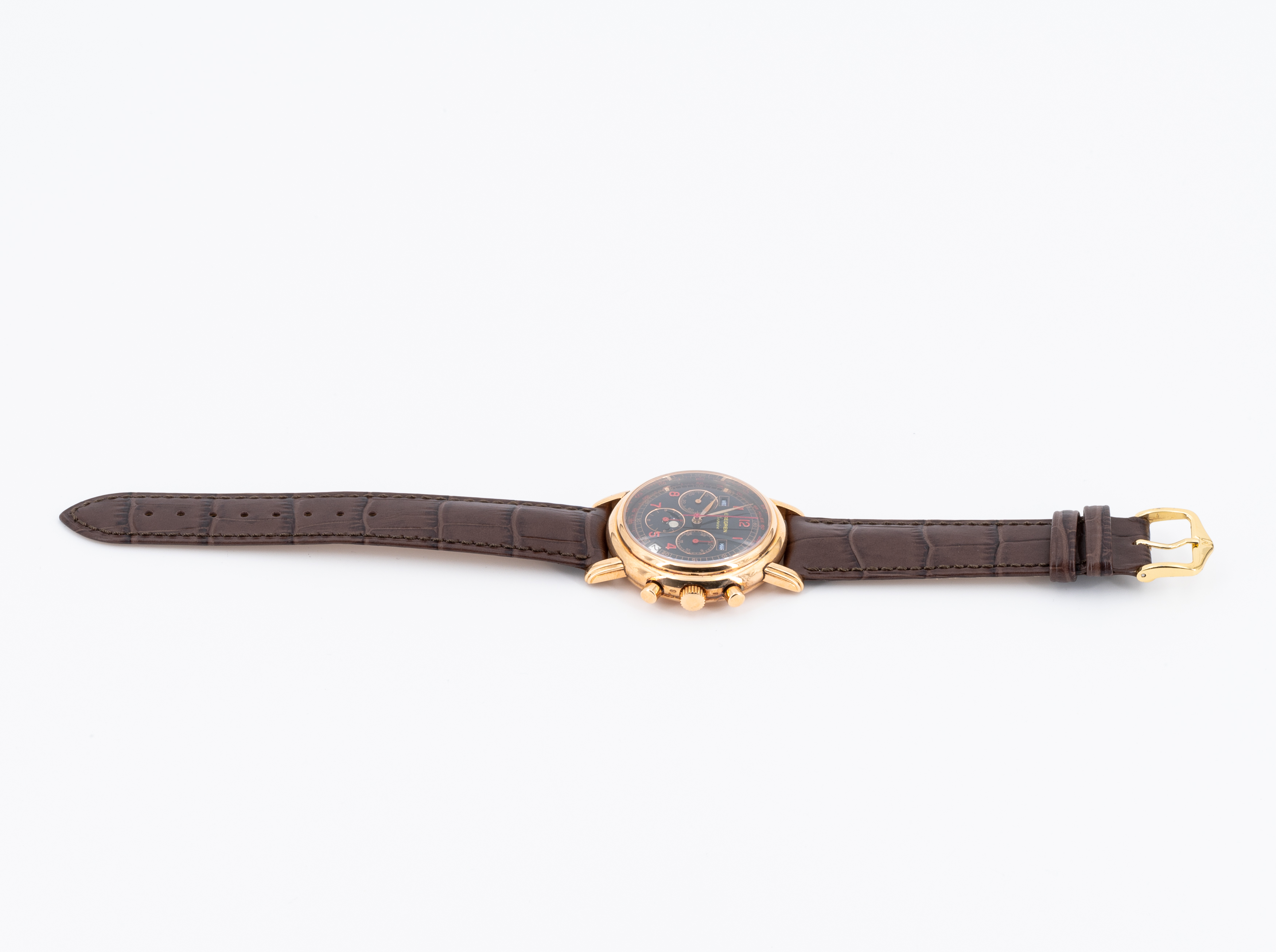 Gehäuse/Armband: 750/- Roségold, Lederband mit Dornschließe, Zffbl. schwarz, arabische Ziffern rot, Zeiger golden und rot.