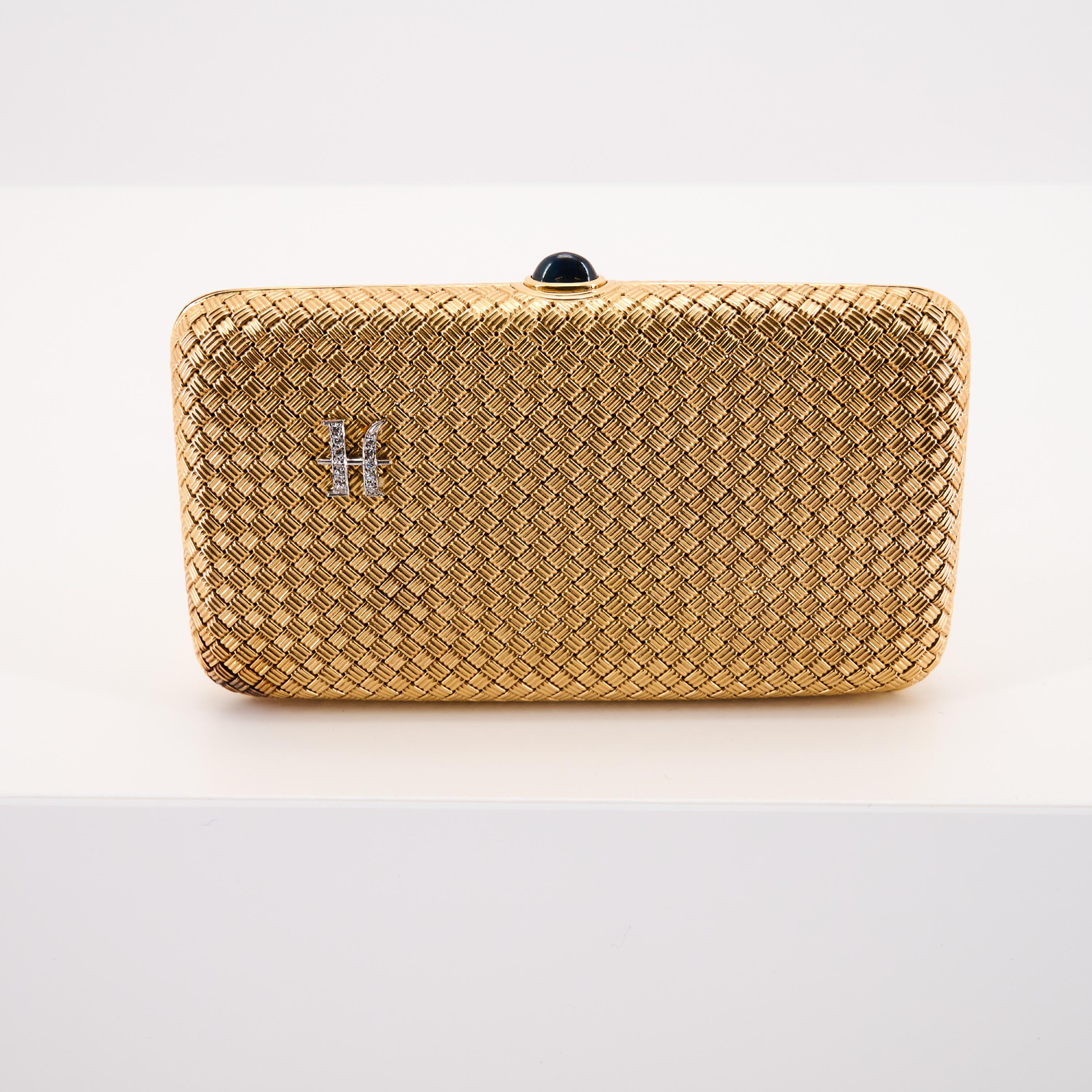 Beschreibung: In der rechten Ecke der Oberseite ligiertes Monogramm "H" mit Brillantbesatz.