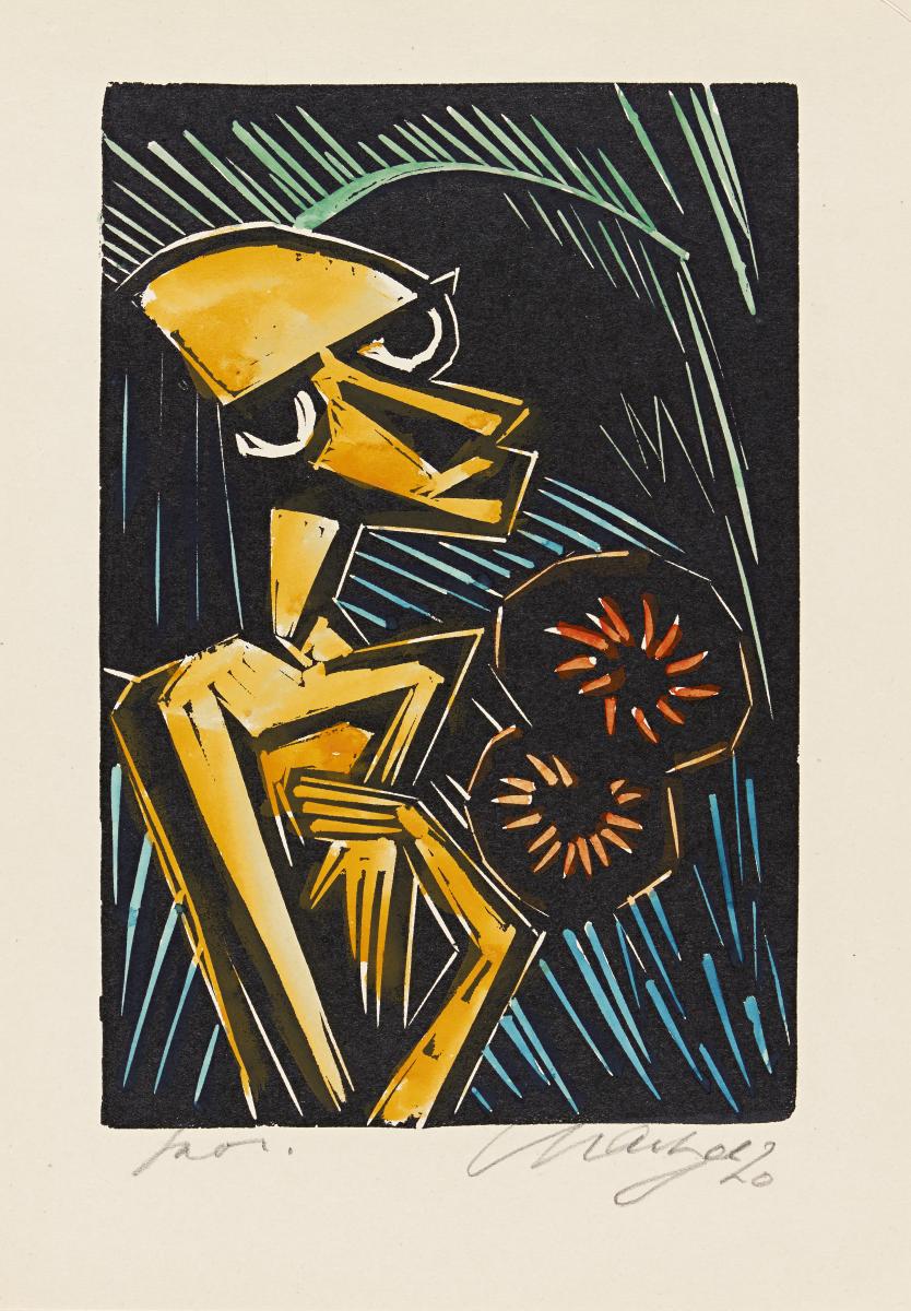 Technik: Aquarellierter Linolschnitt auf Bütten.