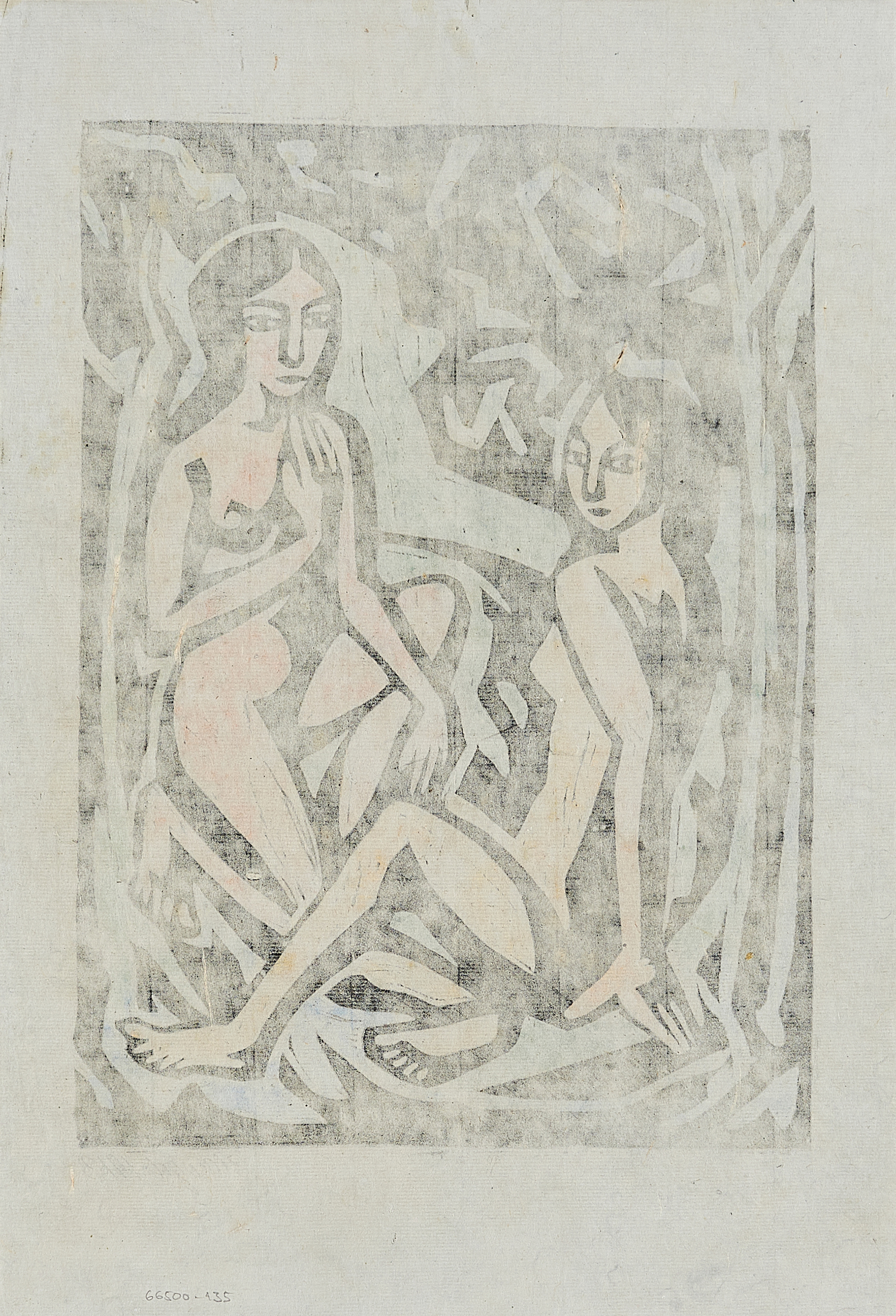 Technik: Aquarellierter Linolschnitt auf Papier.