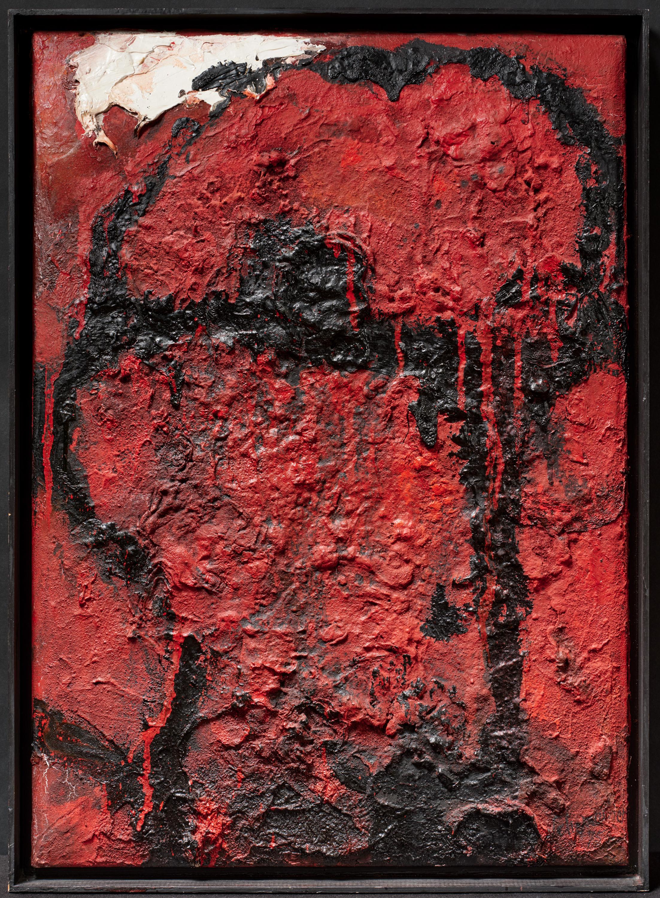 Im vorliegenden Werk "Ablon" (1975) ergießt sich pastose rote Farbmasse wie zähflüssige lodernde Lava über die Bildfläche. Sie scheint von der Entstehung der Erdoberfläche aus glühendem Gestein zu erzählen: In diesem vulkanischen Motiv haben sich Strukturen von innen heraus, gleichsam in einem eruptiven Akt, gebildet und sind zur schrundigen Farbkruste erstarrt.