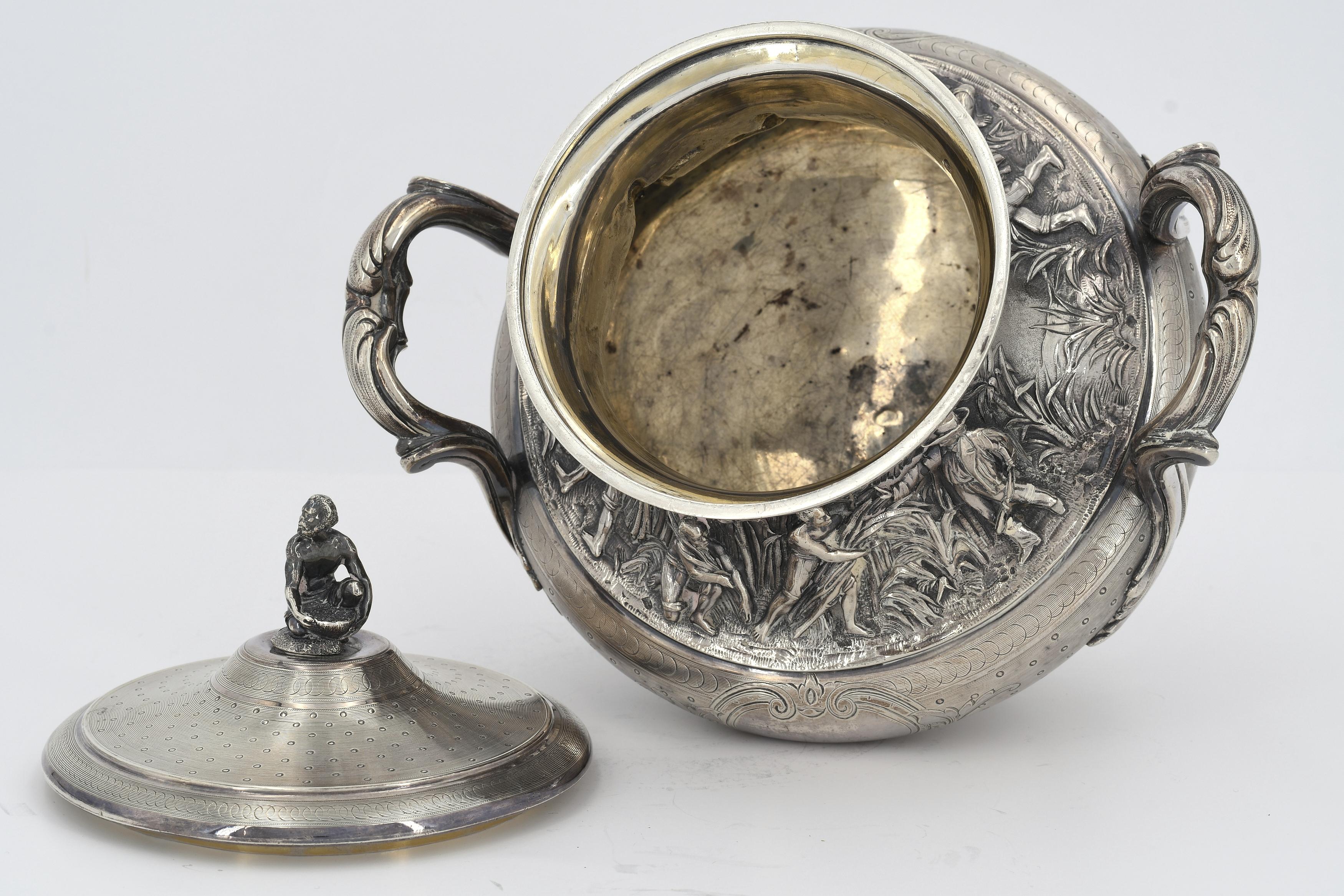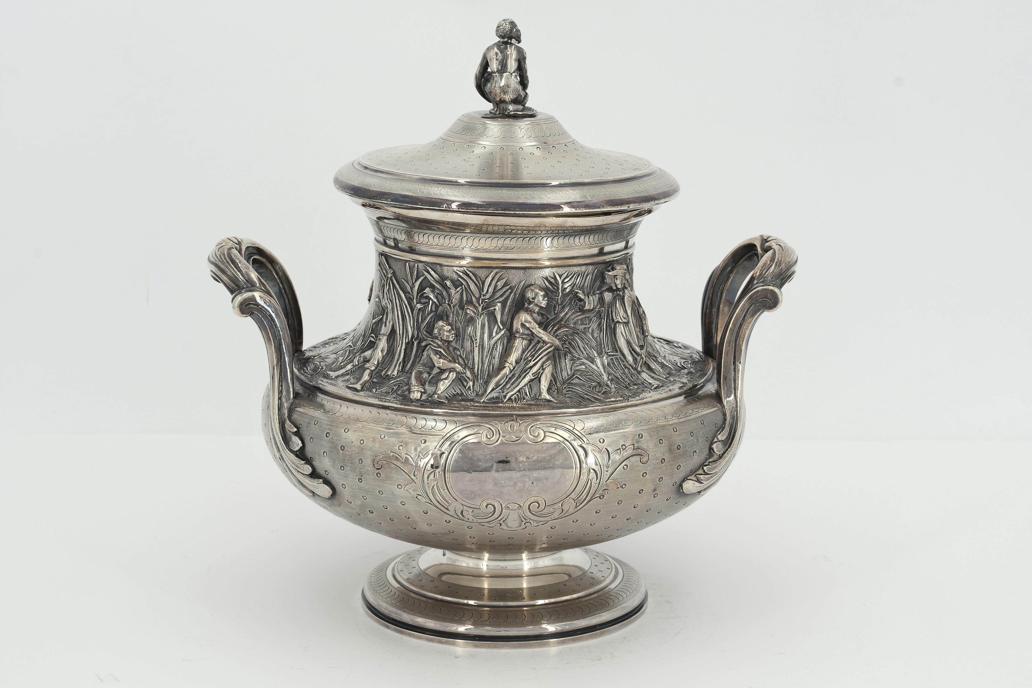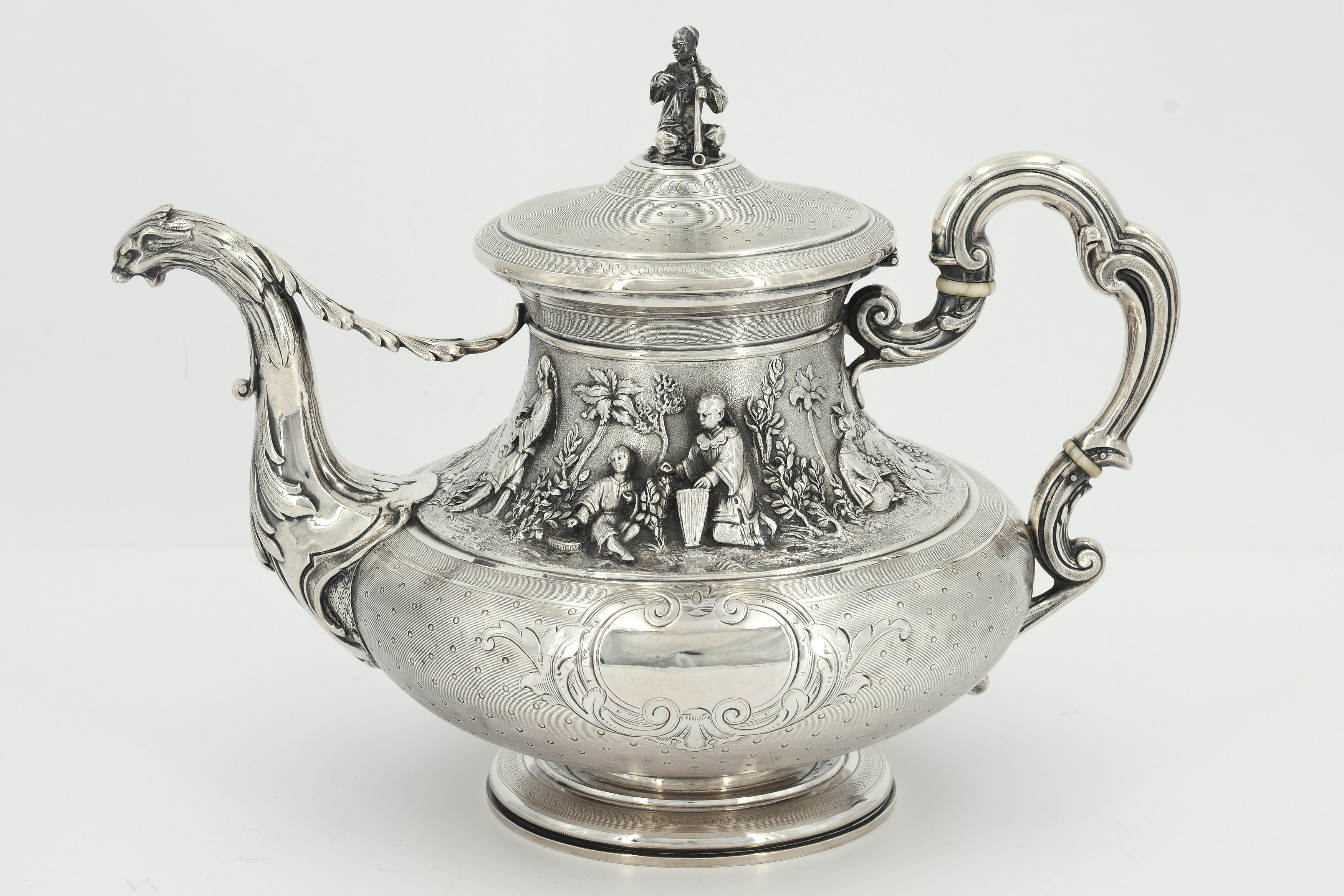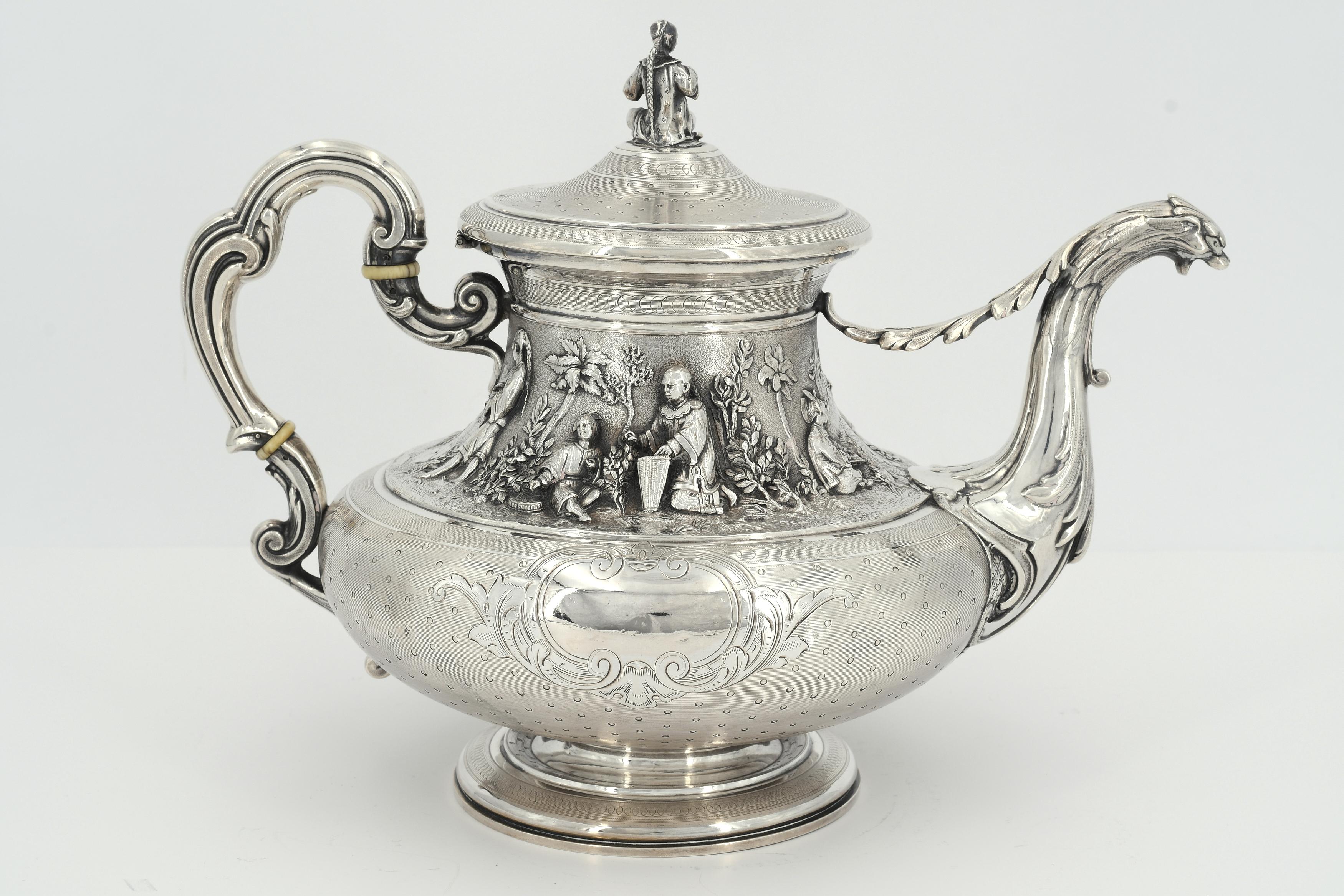 einer Teekanne mit figürlichen Szenen des Teeanbaus in China, einer großen Zuckerdose mit