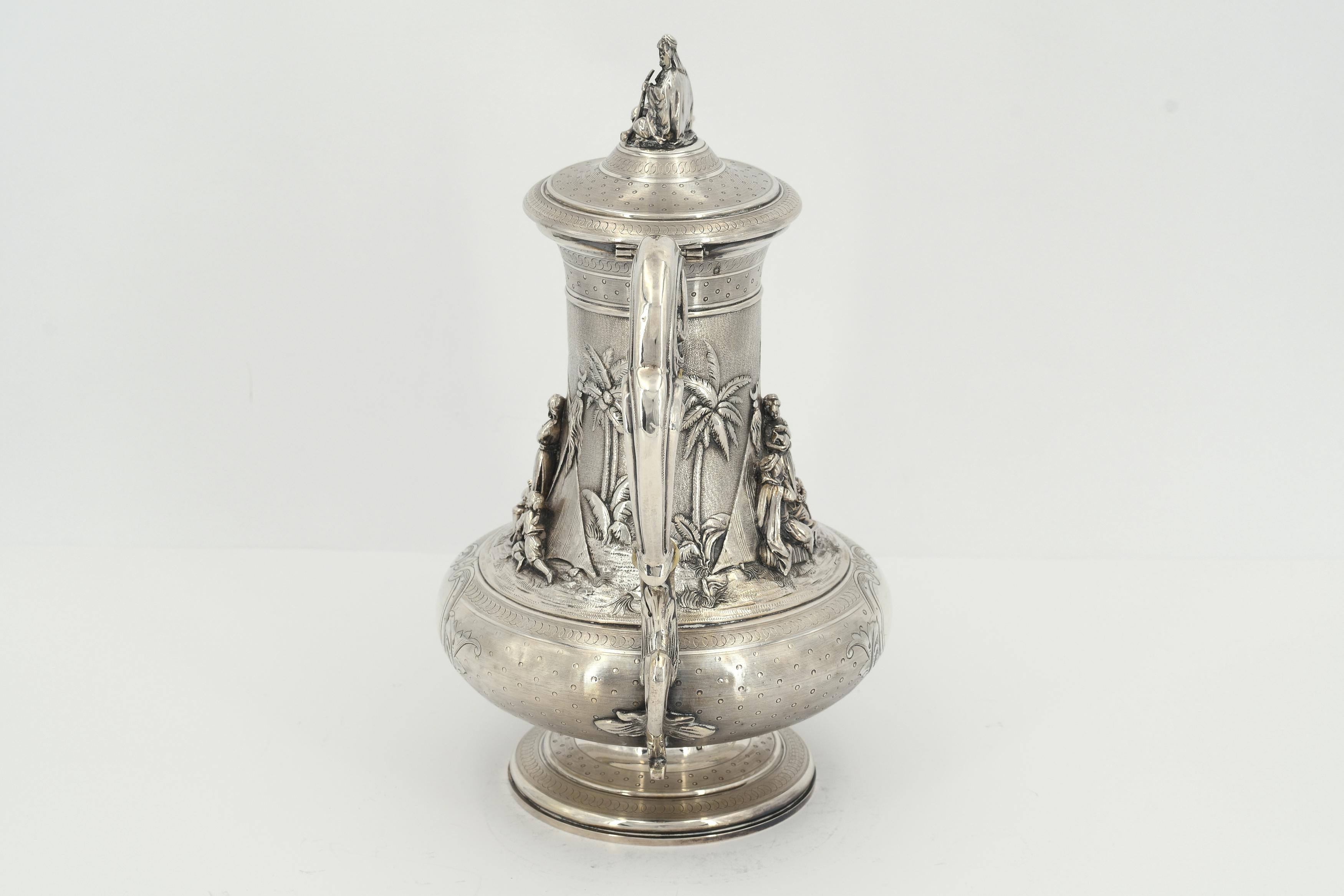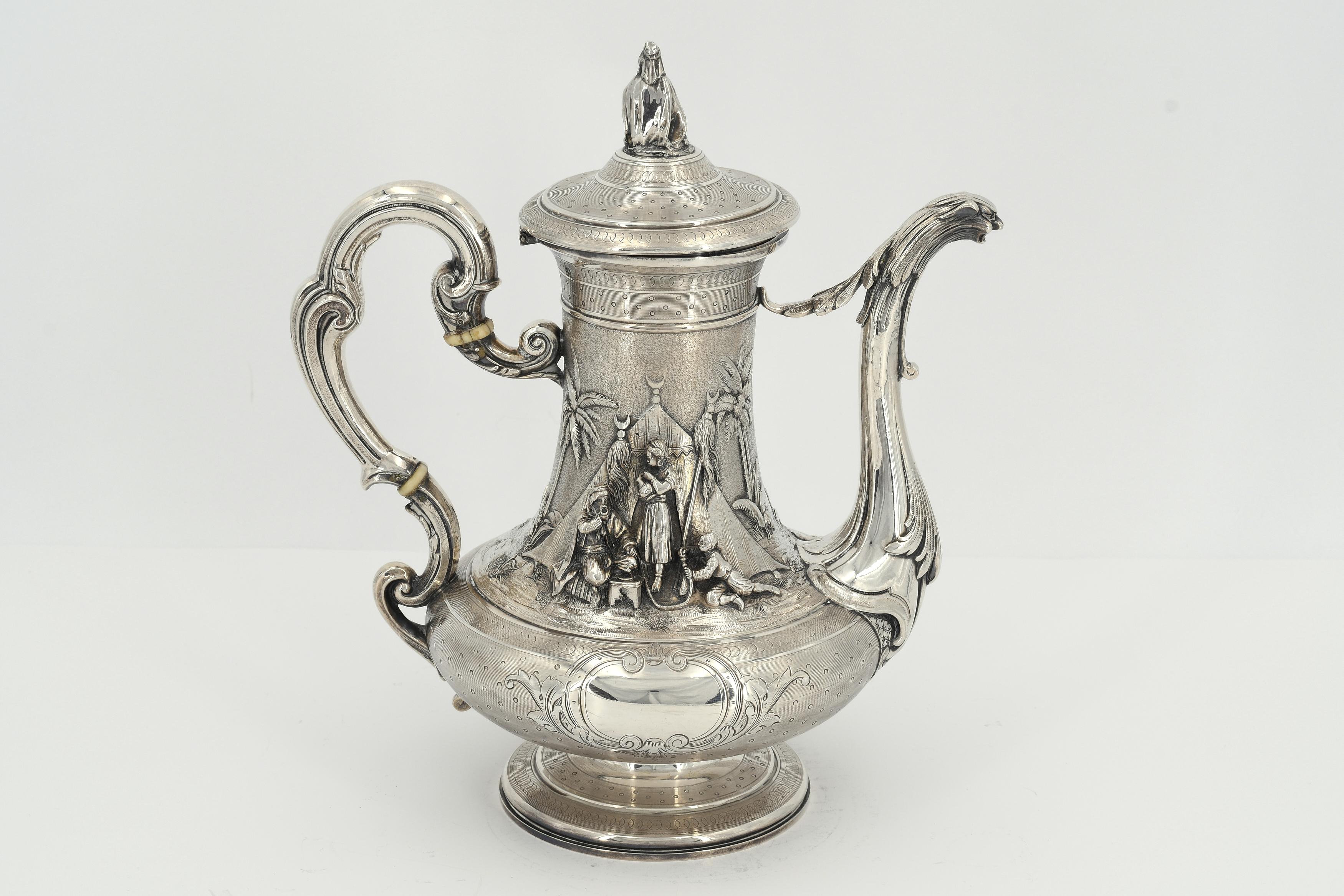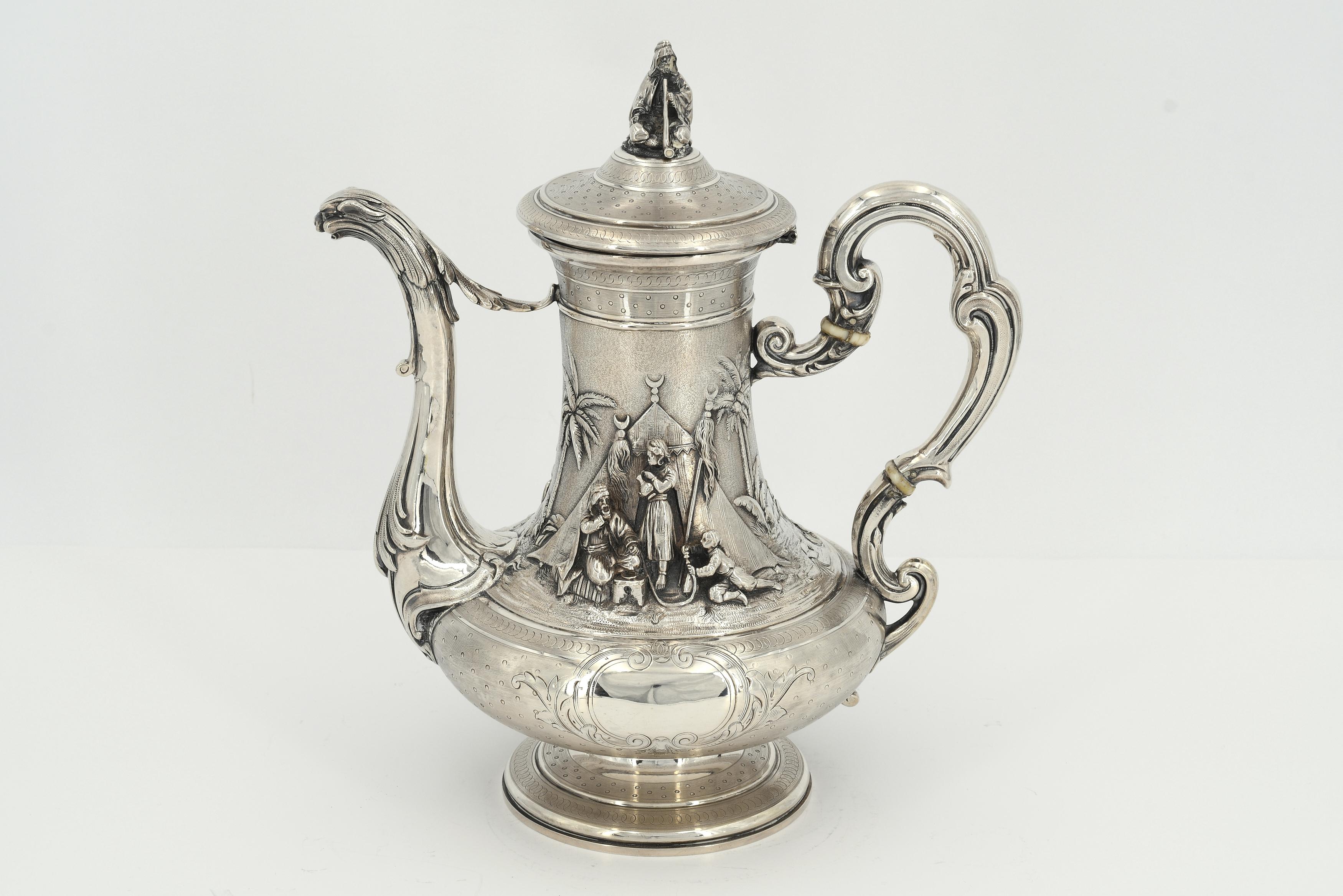 Beschreibung: Bestehend aus einer Kaffeekanne mit Wüstenszenerie, Zelt und Kaffee trinkenden Beduinen,