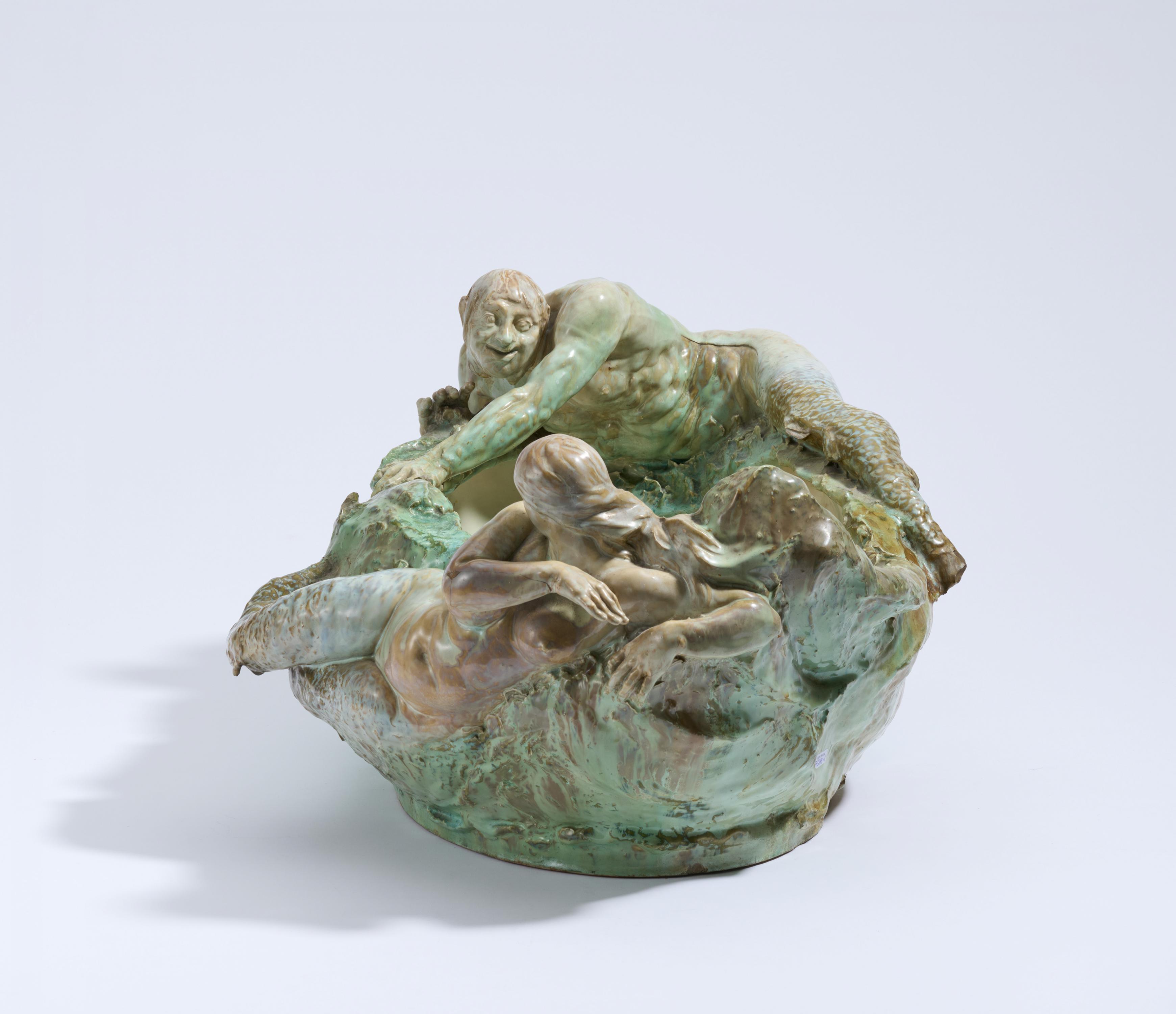 Diese kraftvolle Darstellung - gemeinsam mit der tonigen Farbigkeit der virtuos eingesetzten Glasurtechnik - ist ein beeindruckendes Zeugnis der Formensprache des Jugendstils und zieht den Betrachter in ihren Bann.