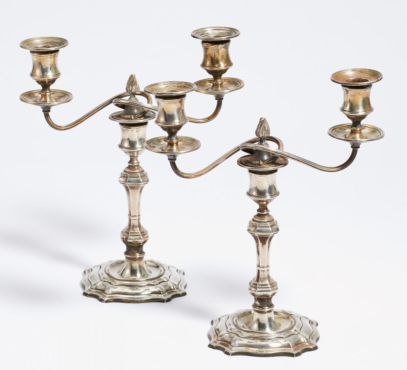 PAAR LEUCHTER MIT ZWEIFLAMMIGEN AUFSÄTZEN.