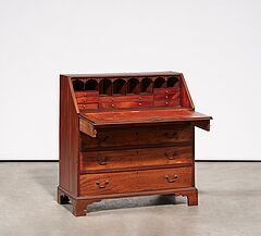 Beschreibung: Vierschübig mit schräg gestellter Schreibplatte. Dahinter reiches Innenleben mit