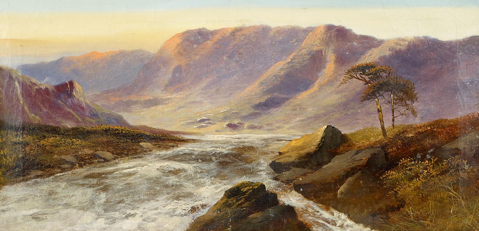 Im schottischen Hochland. Unten links unleserlich: James(?). Öl auf Leiwand. 31 x 61cm. Rahmen.