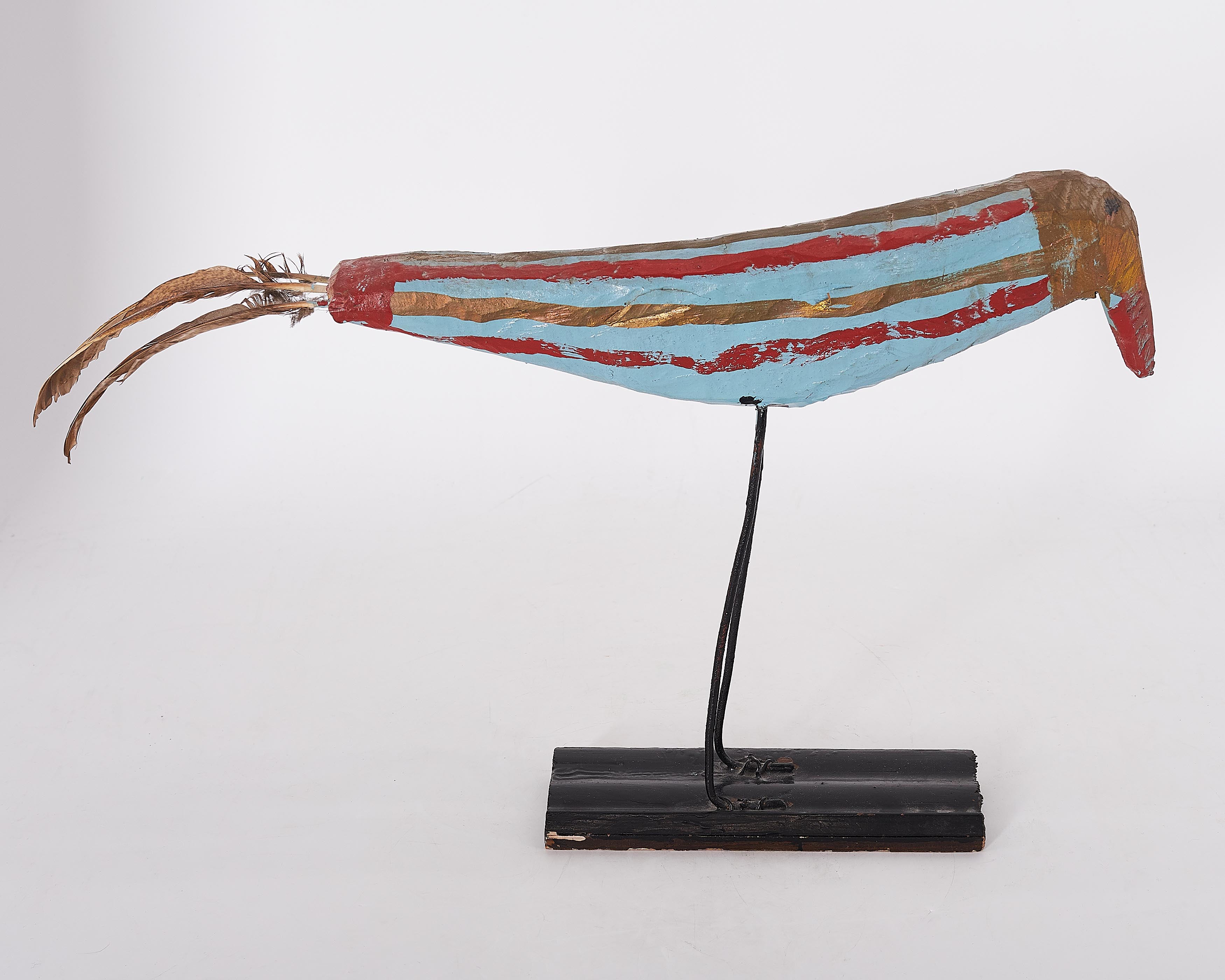 Technik: Holz (farbig gefasst), Federn und Metall.