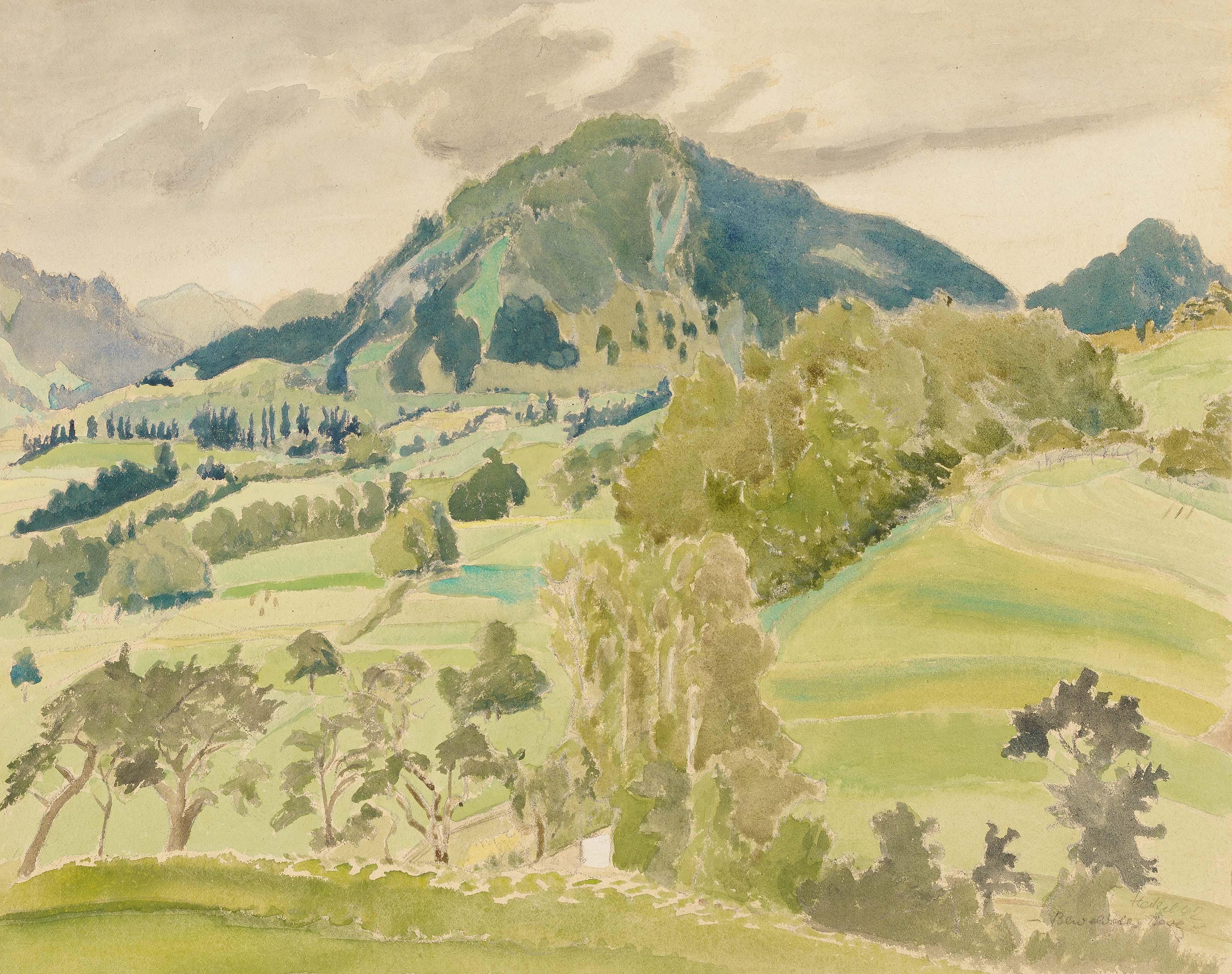 Bezeichnung: Signiert und datiert unten rechts: Heckel 42. Hier zudem betitelt: Bewaldeter Berg.