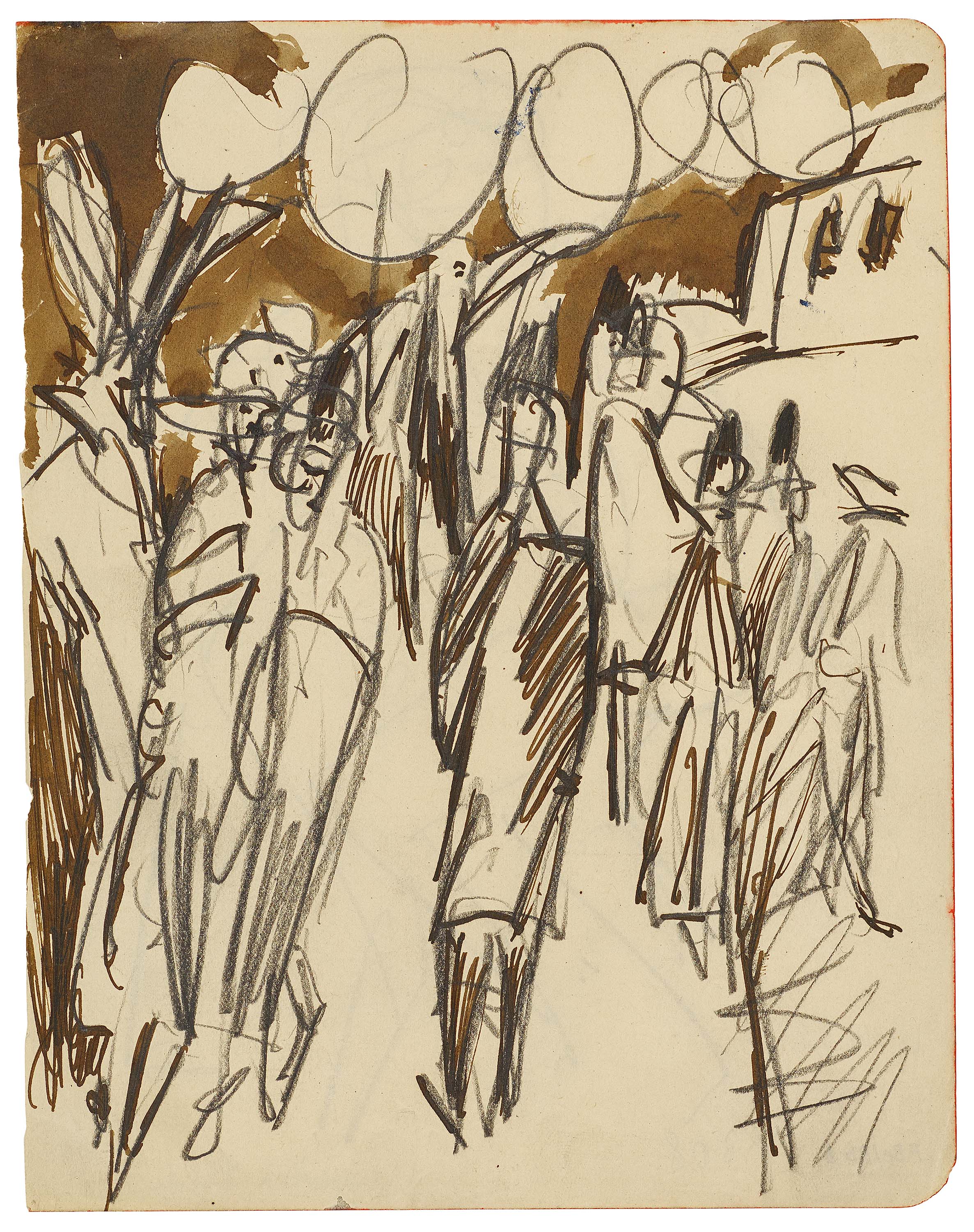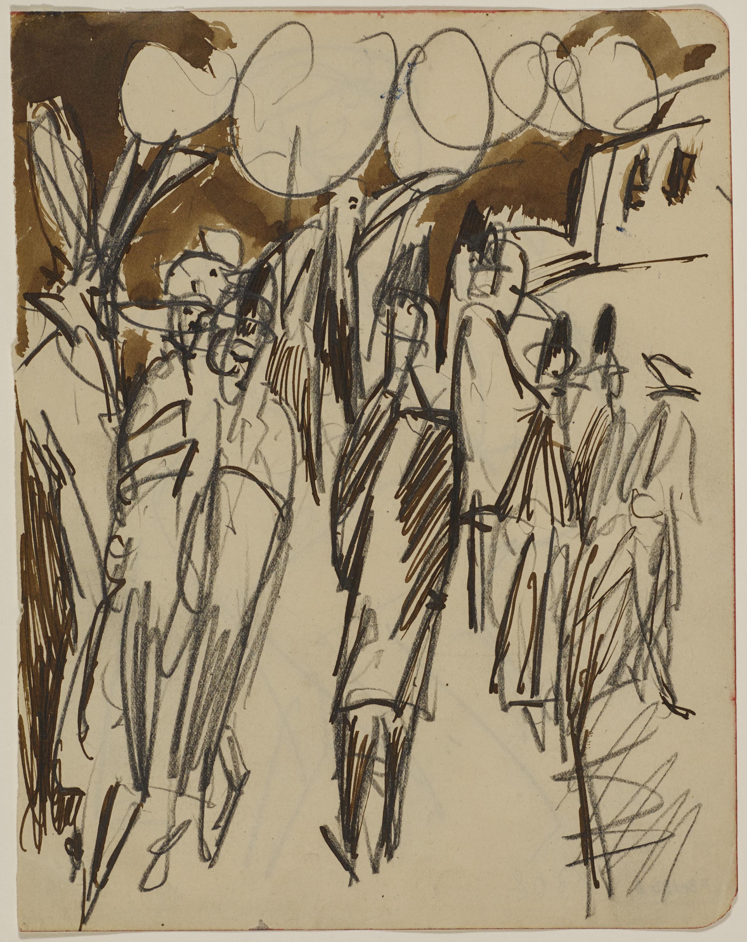 Die Straßenszenen, die Kirchner zwischen 1912 und 1914 schuf, zählen heute zu den Höhepunkten seines Schaffens. Magdalena M. Moeller schrieb: "Mit seinen "Straßenszenen" ist Kirchner der erste deutsche Maler des modernen Lebens." Dieses Blatt nimmt - das mag der Grund sein für Kirchners Weiterbearbeitung - den nervösen, hektischen Rhythmus der Metropole auf in den hart gesetzten Tuschfederschraffuren des Mittelgrundes. Im Kontrast dazu füllen die mit einem Tuschpinsel aufgetragenen Flächen den Hintergrund.