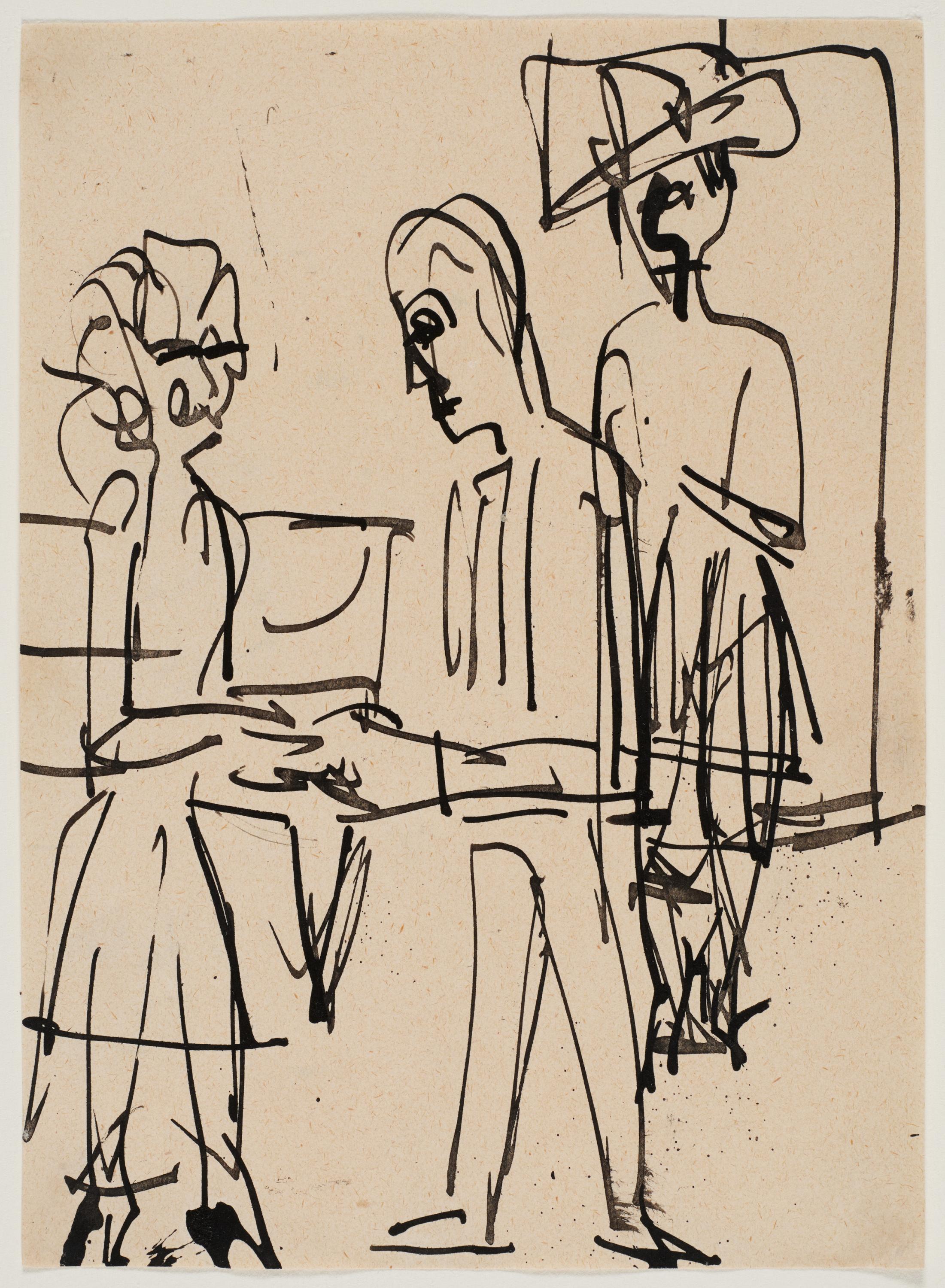 Vermutlich eine Ateliersituation, in der der Maler - es mag Ernst Ludwig Kirchner sein - sein Modell zeichnet. Es mag Erna Schilling sein. Bezeichnend für diese Zeit ist die verdichtete, kompakte Lineatur, die die Möglichkeiten der Tuschfederzeichnung ausschöpft.