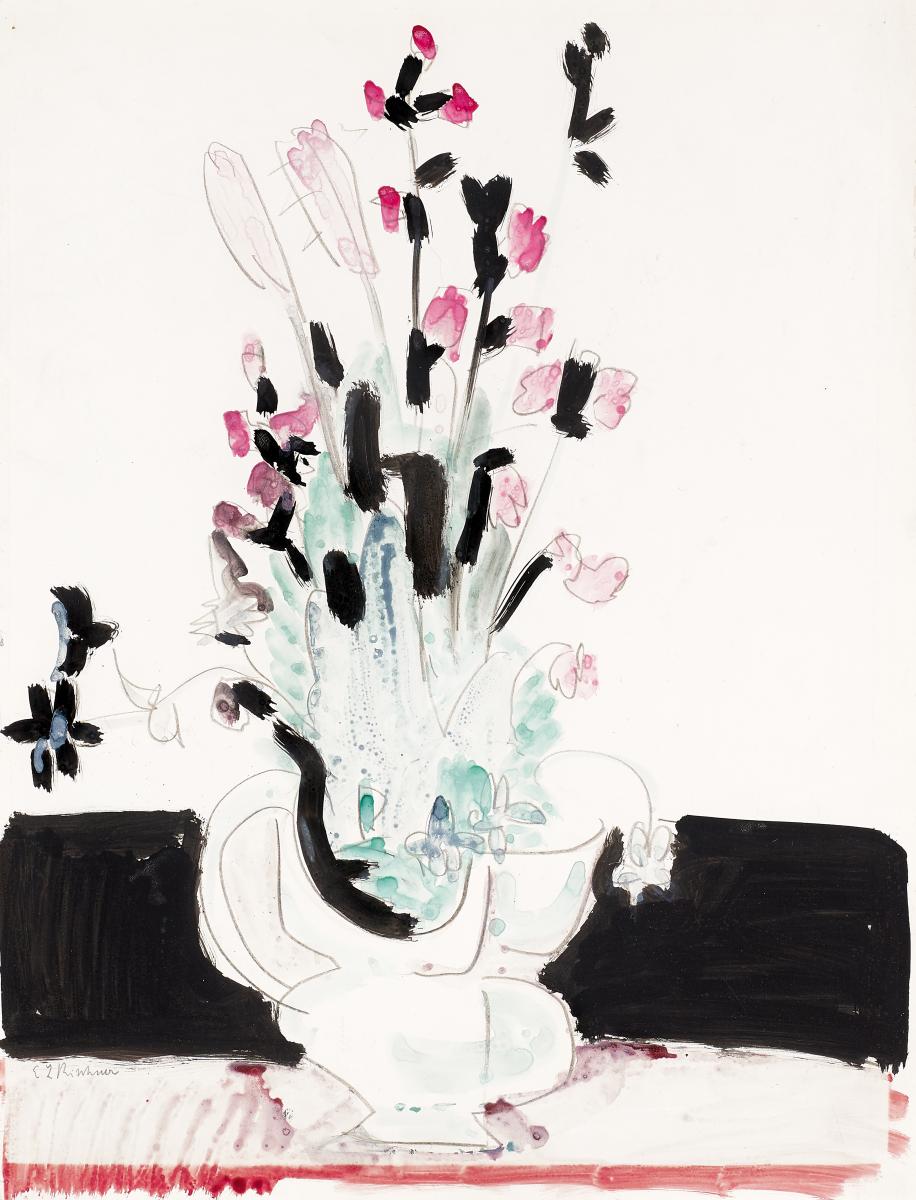 Eine eigenwillige Dynamik geht von der Darstellung aus: Wie ein Feuerwerk scheinen die Blumen aus der Vase emporzusteigen. Dieses Nach-Oben-Streben verstärkt Kirchner nicht nur durch den Farbkontrast von lichtem Rosé und Türkis, sondern auch durch das akzentuiert gesetzte opake Schwarz. Als Ausgleich zu der Aufwärtsbewegung setzt er die breite querformatige schwarze Fläche - eine Wandpaneele oder Kommodenrückwand? -, mit der er zugleich eine Art Rahmen für die Vase schafft. Auf eindrucksvolle Weise verbindet der Maler hier das Empfundene und Gesehene, das er durch die Darstellung in äußerster Nahsicht - der Blumenstrauß nimmt beinahe das gesamte Blatt ein - ins Monumentale steigert.